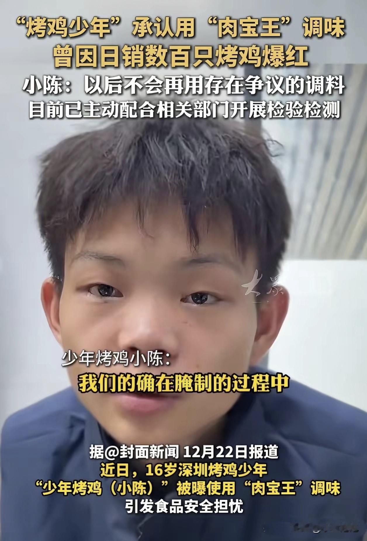 还是太年轻!16岁少年深圳卖烤鸡爆火后,有人劝他低调一点,可他听不进去,还炫耀一天赚几万,以后要开迈巴赫,没想到才过去几日,就被人发现使用肉宝王这种对人体有害的调料。 16岁的小陈靠烤鸡在深圳走红,短视频里他晒出每天卖几百只烤鸡的成绩,说一天能赚几万块,还扬言要靠这生意买迈巴赫。别人劝他稳一点,他根本不听,只顾着高调炫耀,完全没把餐饮经营的底线当回事。 12月22日有媒体曝光,小陈烤鸡用的“肉宝王”调料有问题,这款调料被质疑含违规添加剂,吃多了可能伤身体。消息一出,深圳烤鸡少年用肉宝王冲上深圳同城热搜,网友都在担心食品安全。 小陈后来承认用了这款调料,说只是想让烤鸡更香,不知道调料有问题,还表示会配合相关部门检查,以后不用争议调料。但网友并不买账,觉得做餐饮的不管多大年纪,都该弄清楚食材调料合不合规,不能拿“不知情”当借口。 其实这种事不是第一次发生,不少网红餐饮为了赚钱,忽略了食品安全。做餐饮的核心根本不是流量和赚钱速度,而是把安全放在第一位,年轻从业者更得明白这一点。 目前小陈烤鸡摊位的检测结果还没出来,市场监管部门也表示会严查网红餐饮的添加剂使用情况。这件事也让大家看到,网红餐饮走红的背后,可能藏着不少安全漏洞。 你认为小陈说的“不知情”能成为理由吗?欢迎在评论区说说你的看法。