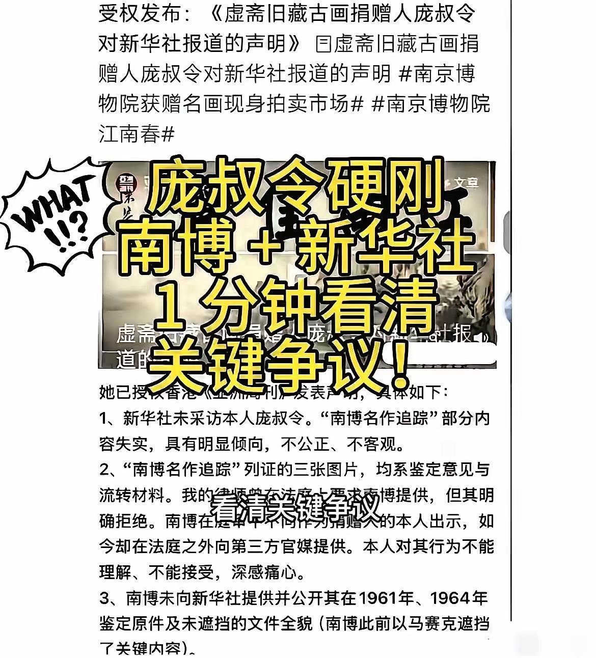 庞家一跑到香港发声,这事的味儿瞬间就变了!庞叔令直接戳破新华社没采访本人,报道偏得离谱,这波操作简直当众扒了权威报道的遮羞布,太敢说了!更让人膈应的是,南博给媒体的关键证据,竟是庞家打官司时求而不得的东西,法庭上藏着掖着,转头就给媒体,这选择性公开的猫腻谁看不明白? 打满马赛克的鉴定报告纯属糊弄人,1961年明明写着明代陈鎏题引首是真,说明画里必有明代真迹,偏把核心鉴定依据糊死,真假全凭一张嘴,遮遮掩掩本身就是心虚。七十多岁的庞叔令不求钱只求说法,恰恰戳中文博圈最致命的痛点:连国博都守不住捐赠者信任,以后谁还敢把传家宝贝交出去? 文化传承从不是口号,是藏得住真心、晒得出透明,而非把捐赠当私产随意处置。这事根本不是一幅画的对错,是要倒逼文博系统把账本摊开、把规则立明,不然传承就是空谈。你觉得这事儿能彻底撕开文博透明化的口子吗?评论区聊聊你的看法~