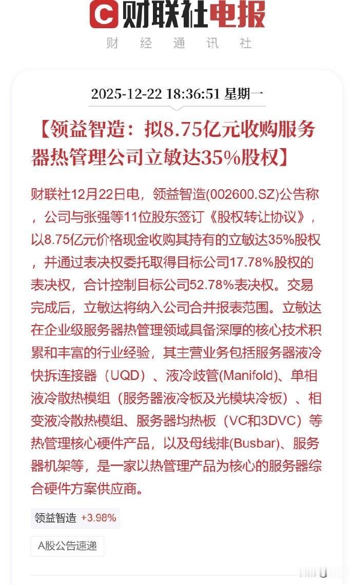 大多数专精特新企业的最好归宿, 2025年12月22日晚,领益智造宣布以8.75亿元 现金收购立敏达35%股权。 立敏达成立于2009年的国家级高新技术企业,专注AI服务器液冷散热全栈解决方案, 立敏达实力不弱: 1,英伟达AVL认证供应商, 2,英特尔液冷联盟成员, 3,施耐德战略合作, 4,富士康供应链, 累计获得101项专利,其中发明专利占比达35%, 领益精密