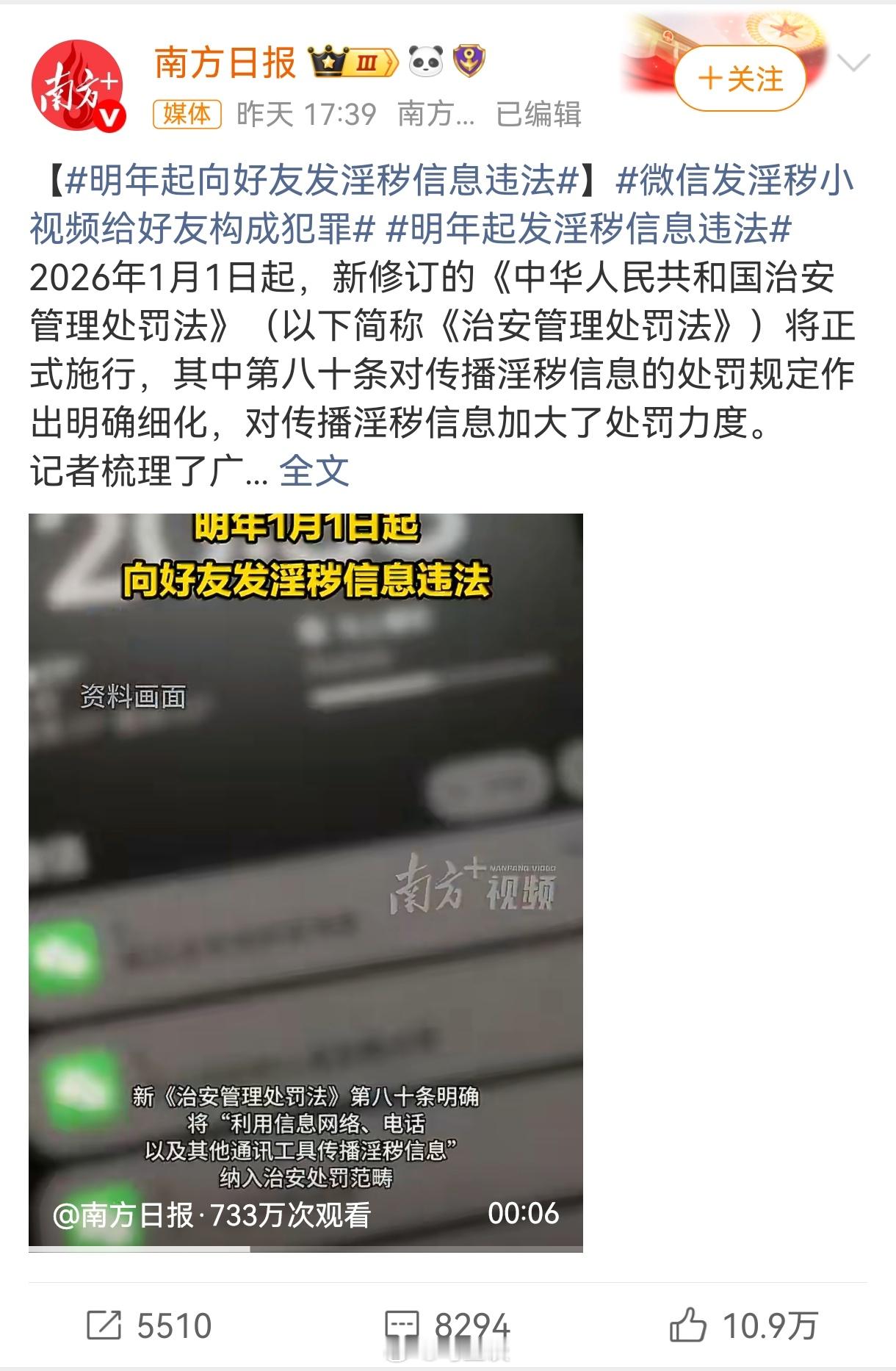 明年起向好友发小视频也违法?从法律上看似乎是这样,但我对南方日报天然持有一丝怀疑,一般来说,这是以举报为前提,大家不必惊慌,很可能是媒体炒了个冷饭,搞另一个“流量大新闻”。明年起发淫秽信息违法明年起向好友发淫秽信息违法