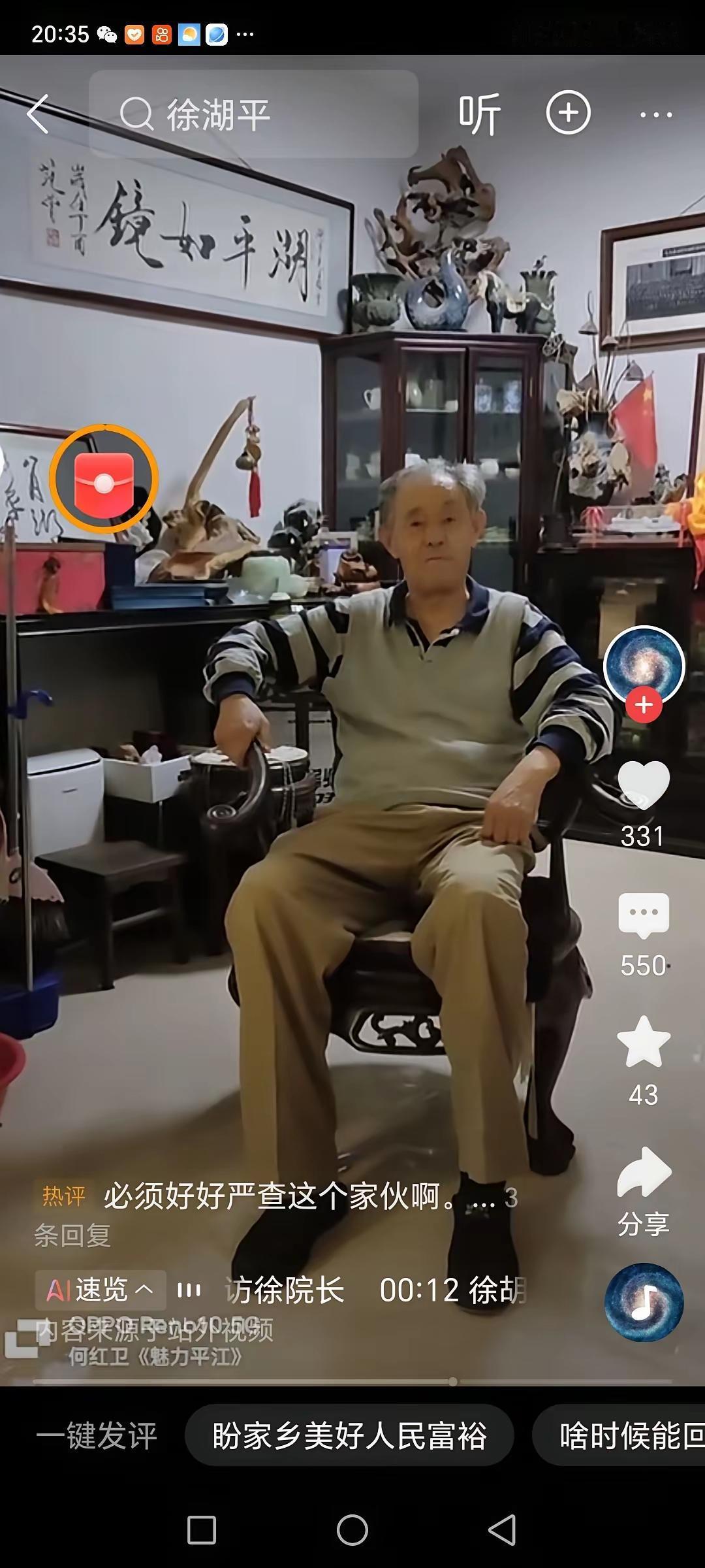 徐湖平这回还能做到“湖平如镜”吗? 徐湖平在南博事件当中,一次又一次闯入大众的视野,备受人们关注,不仅仅因为早在2008年40多名职工举报他,石沉大海,“湖面上一片平静”,更因为他以真作假,以假作真把馆藏宝贝倒腾出去,从中赚取巨额差价。现在是各种线索的矛头都指向了他,不知道八十多岁的他,会不会如锋芒在背? 还有,眼尖的网友不仅发现徐馆长在家坐的是黄花梨木太师椅,而且发还发现他身后柜子上架着一些绝非赝品的“宝贝”。更讽刺的是,徐湖平身后还挂着一副名家写的字画:湖平如镜。 人们不禁要问,这几个字是真品还是赝品?徐湖平这次还能做到像2008年那样,湖平如镜吗?