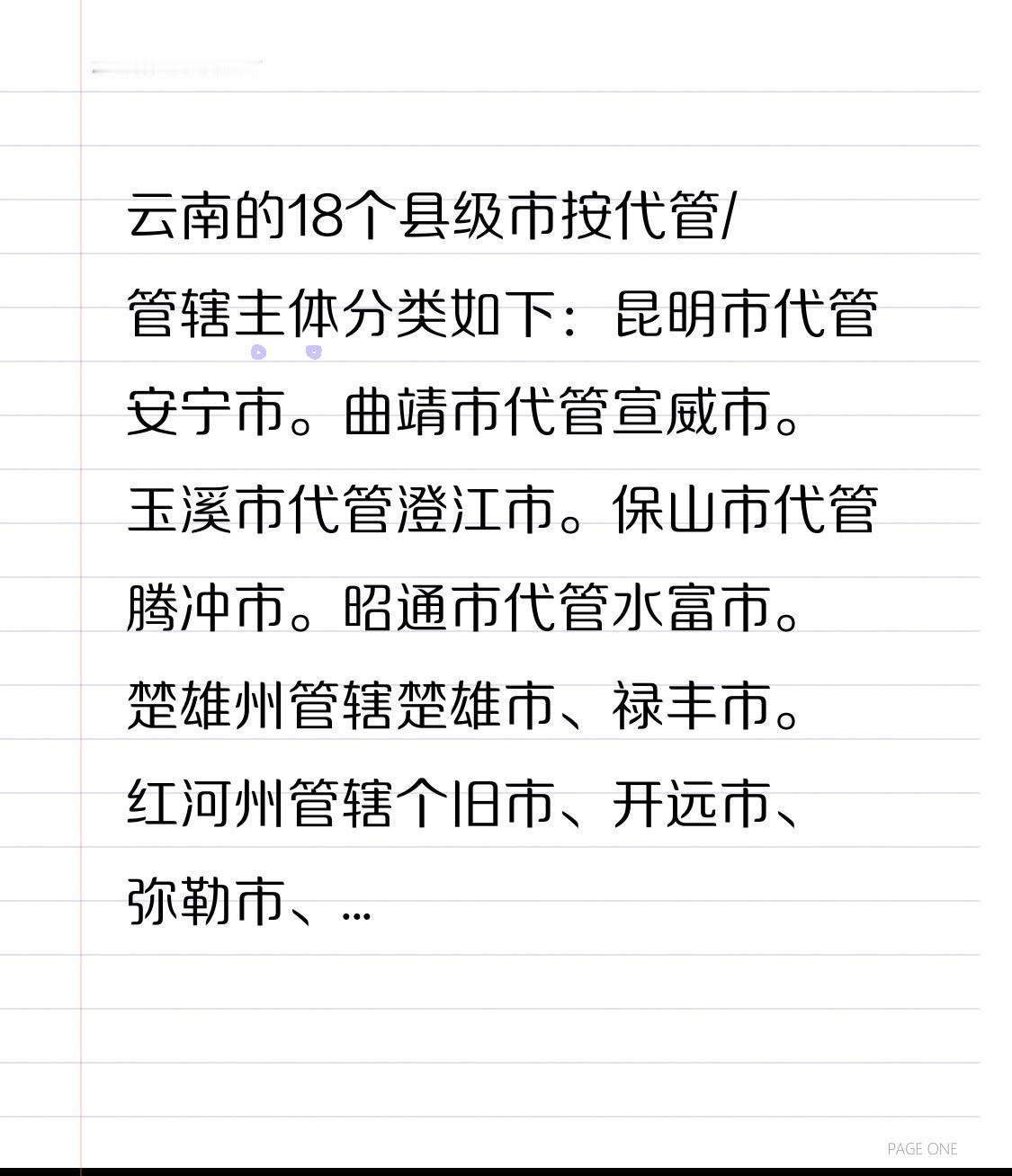 云南的18个县级市按代管/管辖主体分类如下: 昆明市代管安宁市。 曲靖市代管宣威市。 玉溪市代管澄江市。 保山市代管腾冲市。 昭通市代管水富市。 楚雄州管辖楚雄市、禄丰市。 红河州管辖个旧市、开远市、弥勒市、蒙自市。 大理州管辖大理市。 德宏州管辖瑞丽市、芒市。 迪庆州管辖香格里拉市。 文山州管辖文山市。 西双版纳州管辖景洪市。 云南 县级市
