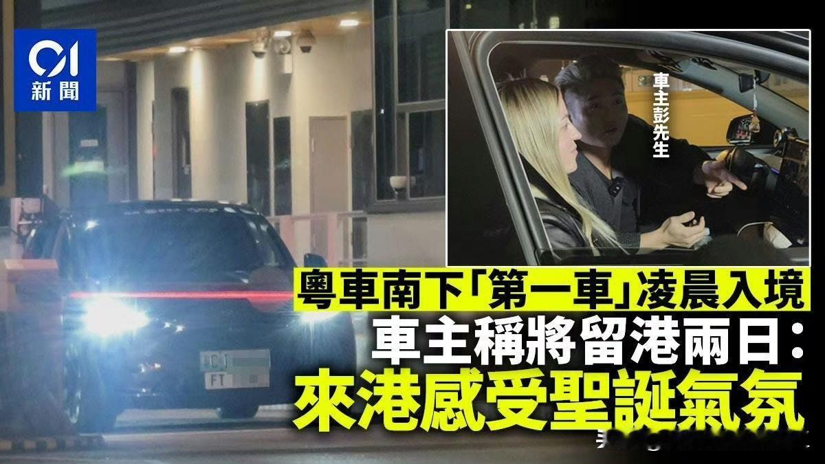 今日开始,粤车可以直接开进香港市区。 首部粤车为珠海车主彭先生驾驶的电动车,他们一行四大一小共五人,将留港两日,称为感受圣诞气氛。 张先生和女友人也驾驶电动车来港,他们表示不担心不习惯:都可以,因喺内地高速已经练习咗好多次,应该冇有问题。有了解一下香港交通规则,都是咁样,无问题。 来源香港“CI 新闻”(香港01)