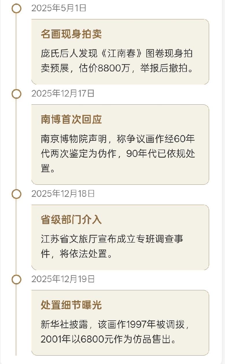 【国家文物局出手!核查南京博物院文物管理问题】 国家文物局今日官宣,已成立工作组,针对南京博物院文物管理中的有关情况开展核查。 这一动作的背后,是此前南京博物院获赠的名画疑似现身拍卖市场的争议,相关专题已经霸占热搜榜,文物管理的规范性问题已经引发全网关注。 文物是国家文化瑰宝,博物馆本是守护文物的重要阵地。 如今却曝出文物处置存疑的情况,难免让网友揪心。 大家最关心的是,此次核查能否查清文物管理的漏洞?又会如何规范文博机构的文物保管流程? 文物保护容不得半点马虎,期待核查结果能给公众一个明确的答案。 也能重拾官方文物管理的信誉。
