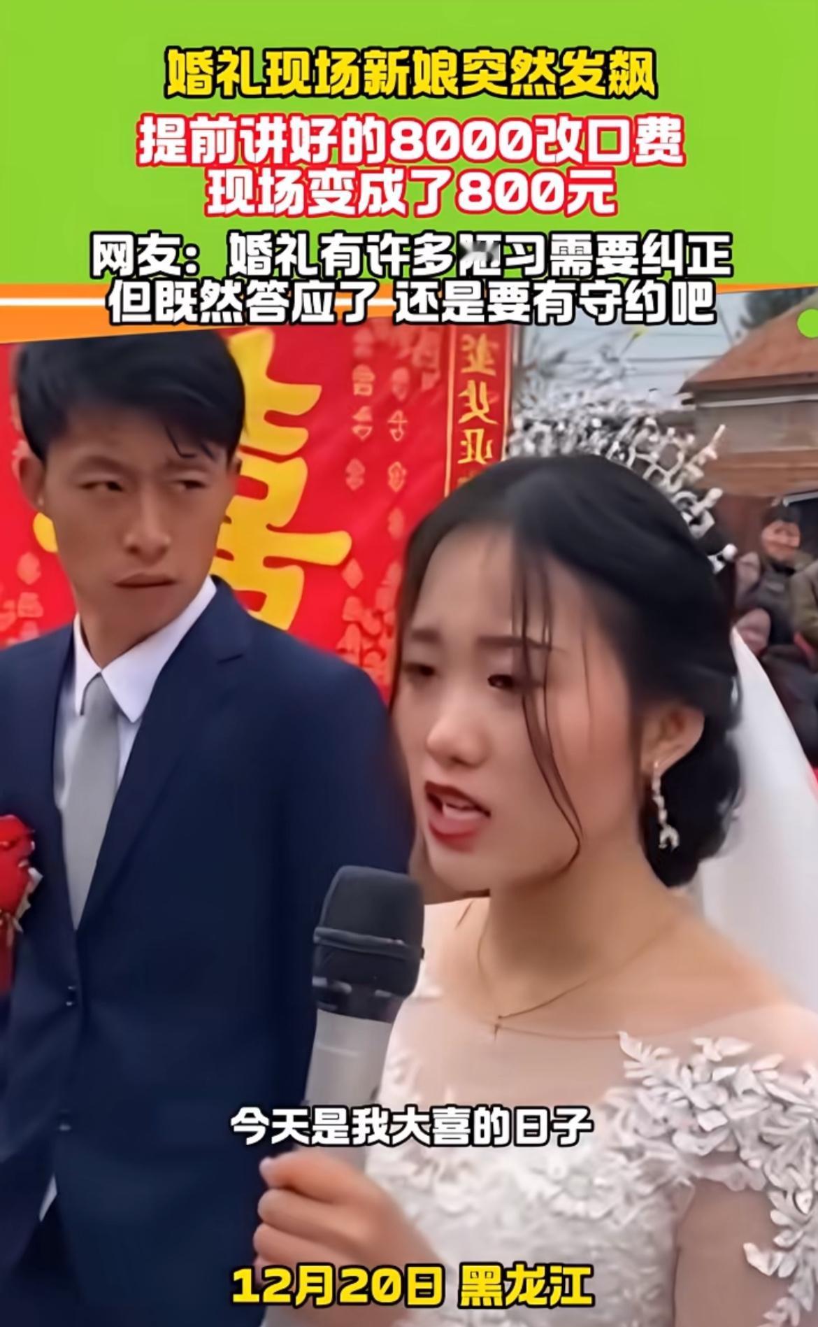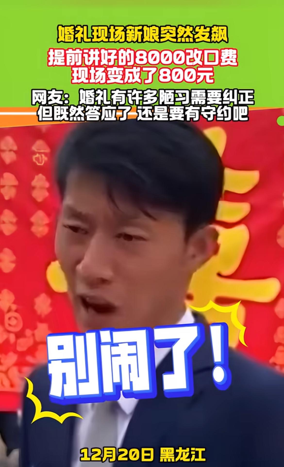 婚礼现场的“改口费风波”真是让人惊掉下巴。前两天一场婚礼上,原本说好了8000的改口费,到现场却变成了800。新娘直接发飙,当场开怼。 有人觉得新娘太猛,大喜日子闹得婆家没面子。但这可不只是钱的事儿,是态度和尊重问题。结婚过日子讲究个“信”字,这点小事都糊弄,以后几十年咋指望对方? 就像张丽,婚前和男方说好了八千改口费,结果当天变八百,她直接离去,让婆家成了村里笑话。这新娘发飙看似冲动,实则是在立规矩,免得以后受委屈。