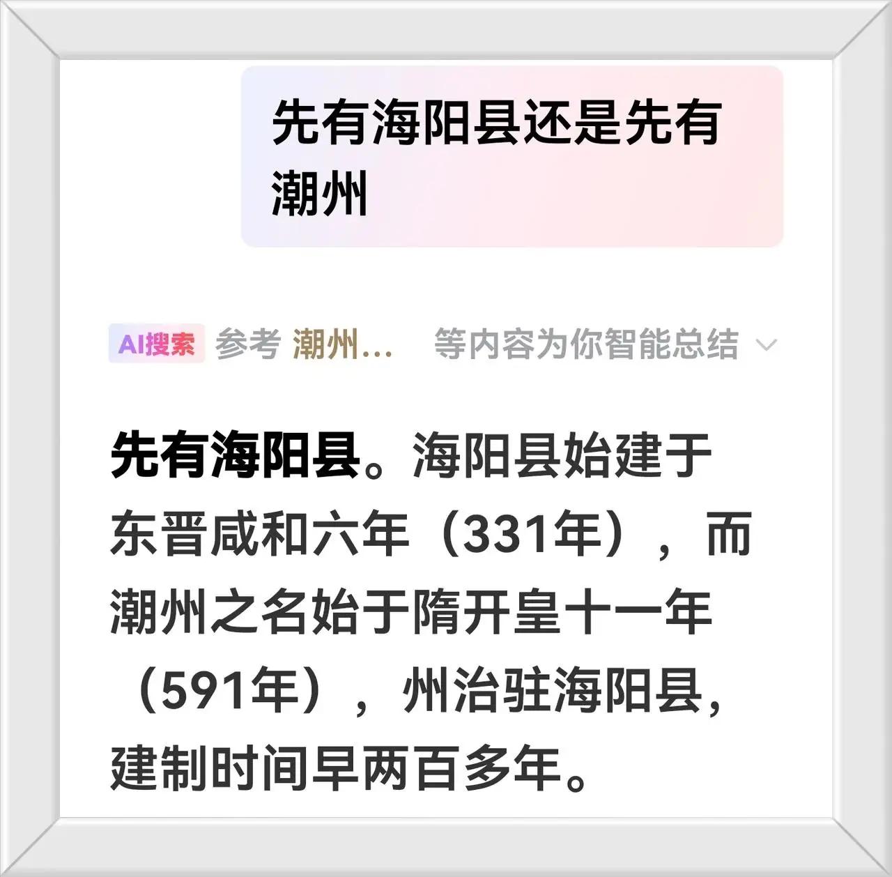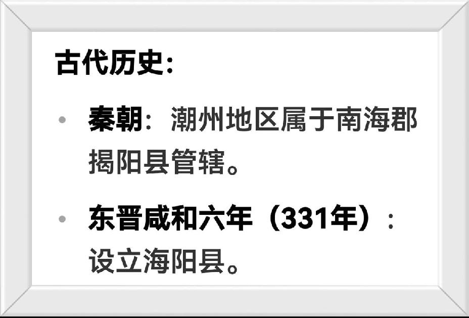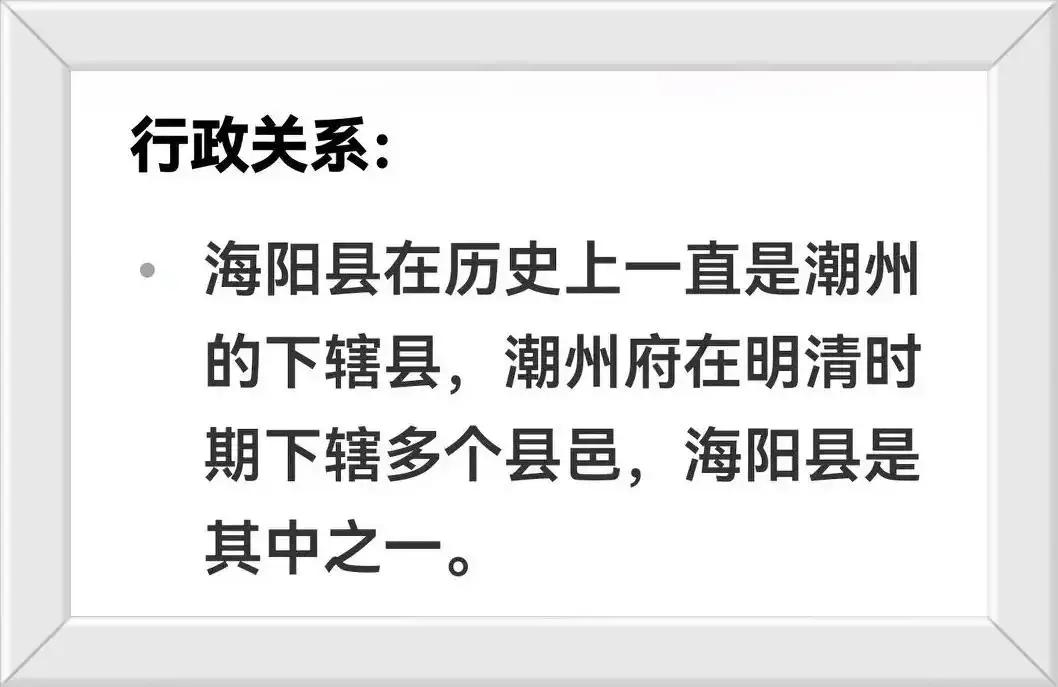 潮州比海阳县还慢有260年。//@远见卓识艺术家YfM:潮州一千六百多年,揭阳八百多年,揭阳连千年古县都评不上,潮州是国家历史文化名城!揭阳是什么?潮州是世界美食之都!揭阳是什么?揭阳是南宋从海阳县分折而成立的,至今才八百多年,多读书,少丟人!!!!.