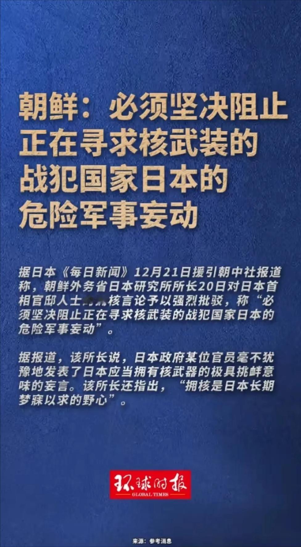 日本该傻眼了! 前脚才对外宣布想拥有核,后脚朝鲜的阻止发文就来了,这不是因为朝鲜看不惯日本,而是日本作为战败国,在国际上是不允许有核的国家,他只能拥有自卫队,就连军队都不能拥有,现在好了居然还想着拥有核。 日本政坛算是彻底把“核野心”摆到了台面上,先是首相高市早苗公然放话“日本应当拥有核武器”,接着又有执政党官员跳出来说要重新讨论“无核三原则”,这一系列操作把周边国家都惊着了。 可还没等日本把这出“试探舆论”的戏演完,朝鲜就直接一盆冷水浇了下来,外务省研究所所长直接发文痛批,明确表态必须坚决阻止这个战犯国家的核武装企图,言辞之犀利,态度之强硬,直接把日本的嚣张气焰压了下去。 明眼人都看得出来,日本这波纯属硬着头皮瞎折腾,作为二战战败国,《开罗宣言》《波茨坦公告》早就把规矩定死了:必须彻底解除武装,压根没资格碰核武器这种大杀器。 更别提日本自己定下的“无核三原则”,白纸黑字写着不拥有、不制造、不引进核武器,这既是国际社会的紧箍咒,也是它战后和平发展的底线。 况且日本还是《不扩散核武器条约》框架下的无核国家,履行核不扩散义务是逃不掉的国际法责任,哪能说改就改。 可现在日本政客偏偏要触碰这条红线,说白了就是右翼势力膨胀,想借着所谓的“周边安全环境严峻”,一步步突破战后秩序的束缚,实现“再军事化”的野心。 朝鲜的强硬表态,看似突然,实则一点都不意外。 毕竟作为日本的邻国,又是曾经遭受过日本侵略的国家,朝鲜比谁都清楚,一旦核武器落到日本这个有侵略前科的国家手里,后果有多严重。 朝鲜在声明里直接点破了关键:日本过去的侵略历史已经证明,让它掌握核武器,只会给亚洲带来核浩劫。 这种毫不留情的批判,不仅戳中了日本的痛处,更说出了很多亚洲国家的心声。 而且朝鲜的表态也不只是口头抗议,更是一种明确的警示,如果日本敢冒天下之大不韪突破核红线,绝对不会有人坐视不管。 这一下直接让日本陷入了尴尬境地,原本想试探国际社会的反应,结果不仅没得到支持,反而招来周边国家的一致警惕,连国内的反战团体和在野党都纷纷施压,要求罢免涉事官员,守住“无核三原则”,可谓偷鸡不成蚀把米。 其实日本表露拥核意图、朝鲜强硬反击这事,本质上是战后国际秩序与军国主义野心的正面碰撞,更暴露了中小国家在地区安全格局中的无奈与坚守。 日本之所以敢这么明目张胆地试探红线,一方面是国内右翼势力抬头,想借“安全焦虑”转移国内矛盾。 另一方面也是赌定国际社会不会真的对它动真格,觉得有美国的“核保护伞”撑腰就能为所欲为。 可它忘了,亚洲国家对日本的军国主义历史有着刻骨铭心的记忆,任何试图突破核底线的行为,都会触碰整个亚洲的集体伤痛。 从国家主权和地区安全的角度来看,朝鲜的强硬立场,不仅是在维护自己的安全利益,更是在为所有曾遭受日本侵略的国家发声,守护战后形成的和平秩序。 现在的国际社会,不是谁的野心大就能说了算,更不是谁有靠山就能肆意破坏规则。 日本总想着摆脱国际约束,却忘了一个基本道理:和平不是靠突破底线换来的,安全也不是靠拥有核武器就能保障的。 一旦日本真的开启拥核之路,必然会引发东北亚地区的核竞赛,到时候不仅日本自身会陷入外交孤立,整个地区的和平稳定都会被彻底打破,这是任何一个热爱和平的国家都不愿看到的。 说到底,日本的核野心就是一颗定时炸弹,而朝鲜的强硬表态,就是及时按下了警示按钮。这事也给全世界提了个醒:战后国际秩序不容挑战,战犯国家的军国主义野心必须被死死遏制。 对于日本来说,与其整天琢磨着搞核武器、突破规则,不如好好反思自己的历史,踏踏实实走和平发展的道路。 毕竟,靠武力威胁换不来安全,靠挑战秩序赢不来尊重,这是被历史反复证明的道理。 如果日本非要一条道走到黑,最终只会搬起石头砸自己的脚,被整个国际社会所孤立。