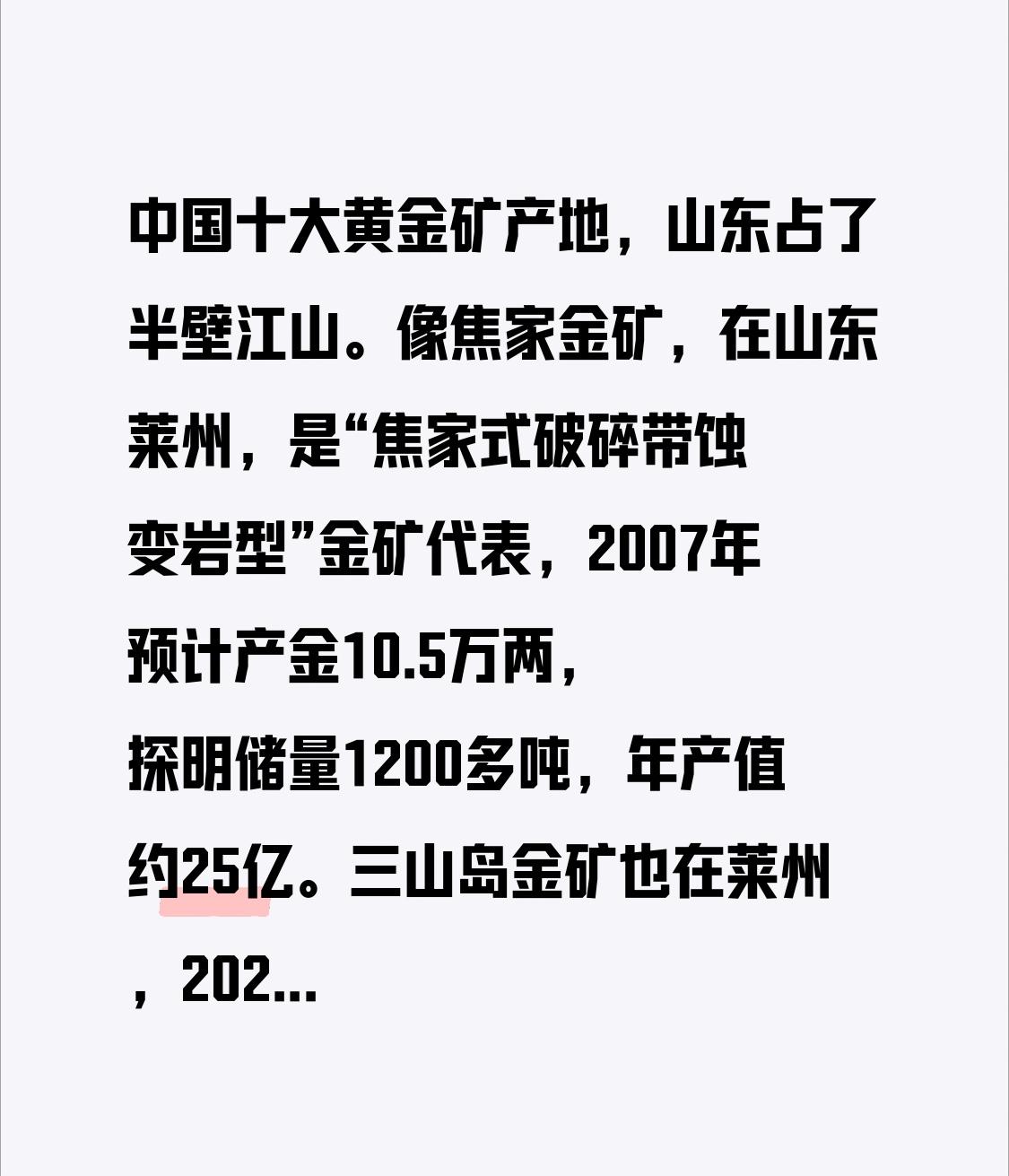 中国十大黄金矿产地,山东占了半壁江山。 像焦家金矿,在山东莱州,是“焦家式破碎带蚀变岩型”金矿代表,2007年预计产金10.5万两,探明储量1200多吨,年产值约25亿。三山岛金矿也在莱州,2023年产量5.77吨,规划产量可观,探明储量980多吨,年产值约22亿。玲珑金矿在招远,开采历史悠久,储量丰富,探明储量600多吨,产值约15亿。 金矿业 唯一世界级金矿在福建紫金山金铜矿,探明黄金储量305吨,年产值约18亿。此外,内蒙古长山壕、甘肃大水、云南鹤庆北衙、贵州锦丰等金矿也各有特色,为我国黄金产业贡献力量。 金矿地图 莱州西岭金矿