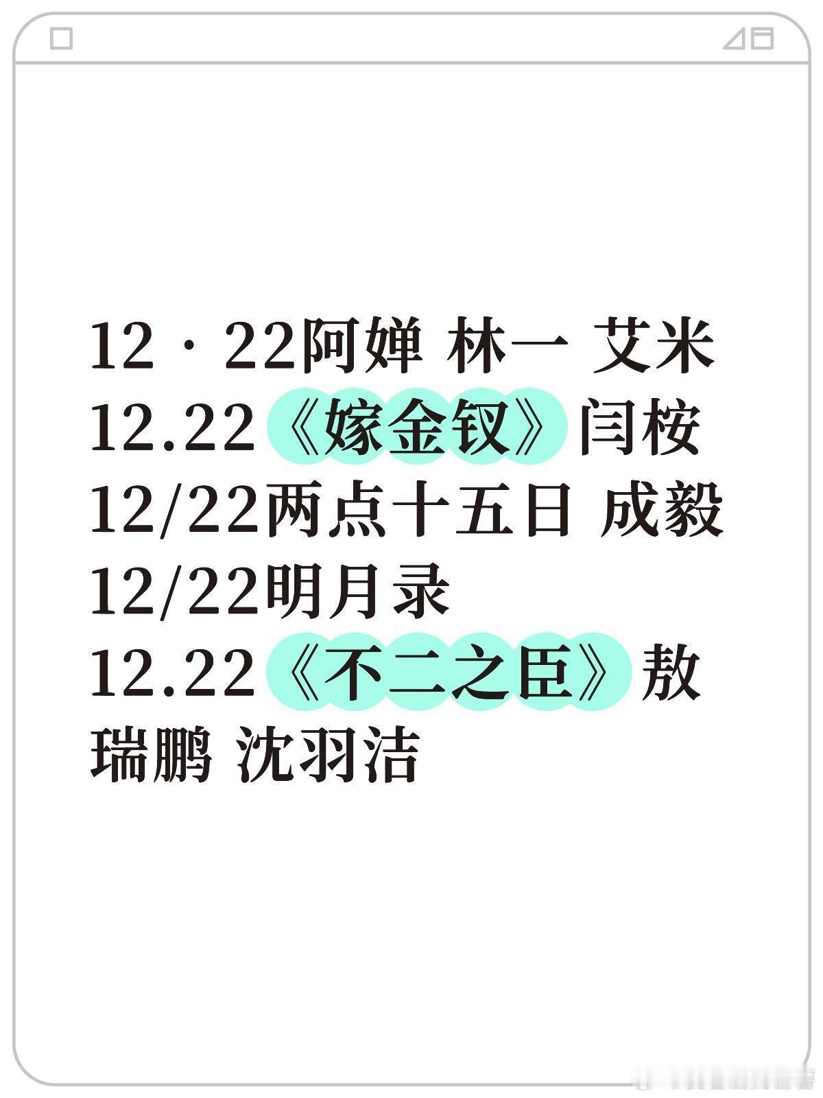 12/22明月录12•22阿婵 林一 艾米12.22《嫁金钗》闫桉12/22两点十五日 成毅12/22明月录12.22《不二之臣》敖瑞鹏 沈羽洁