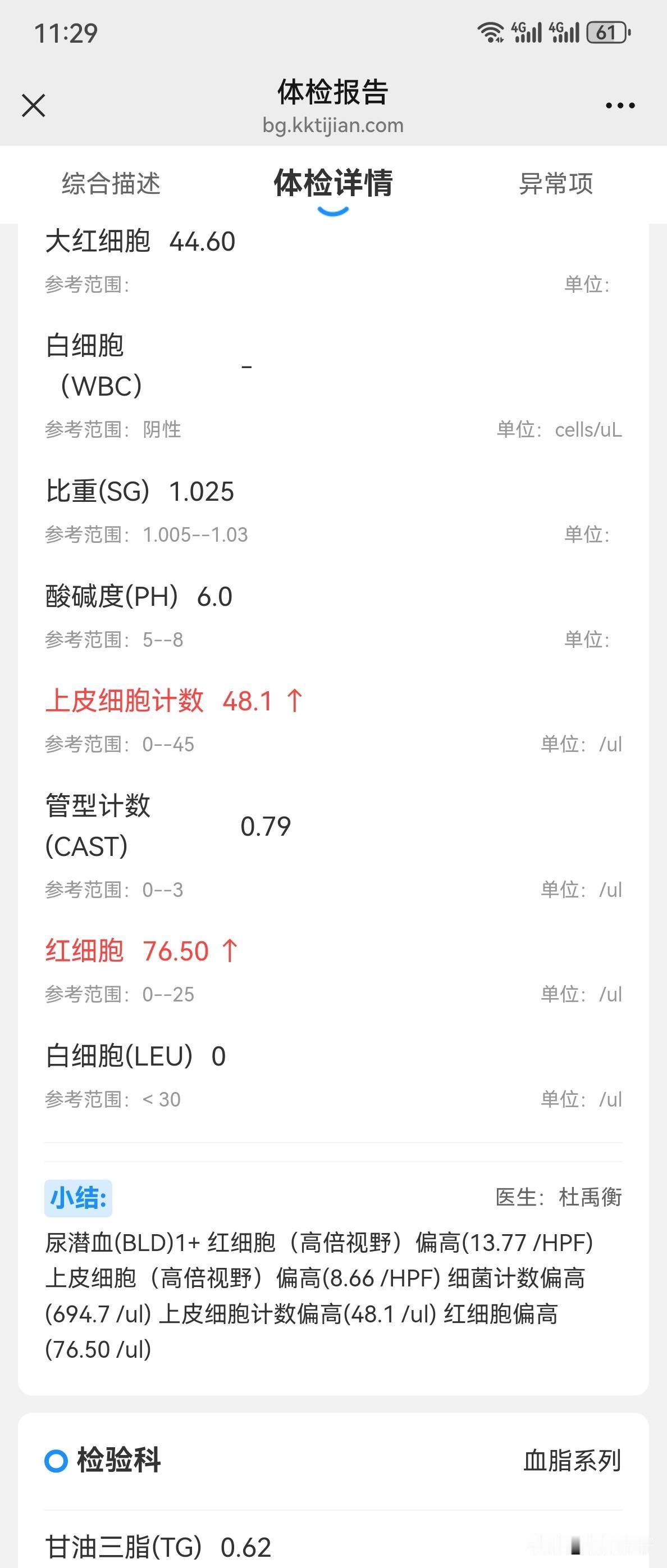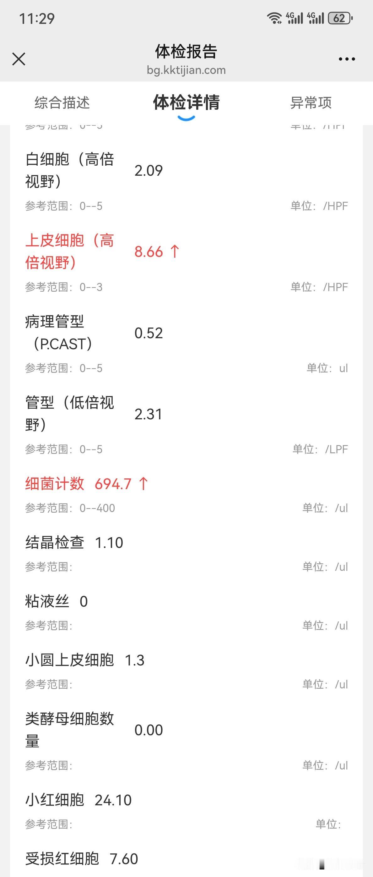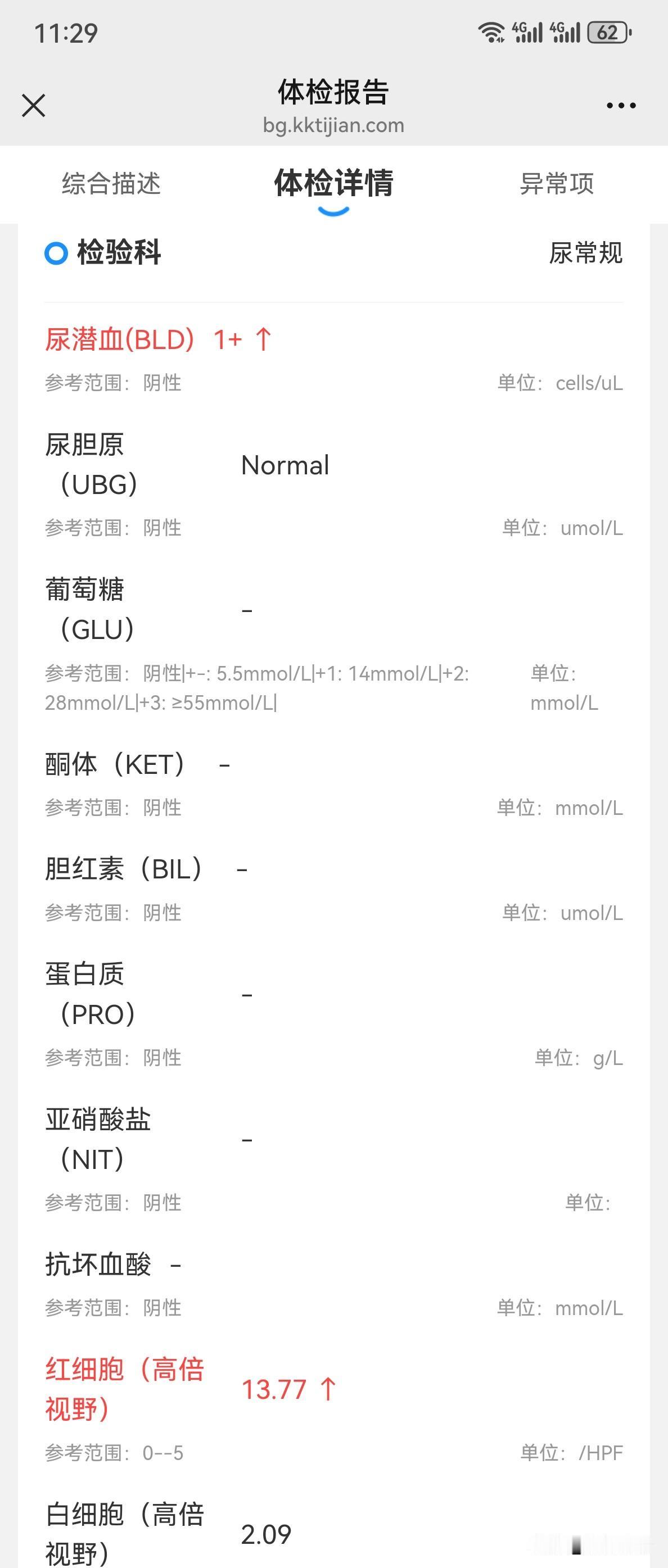 上周做了一次体检,今天早上收到短信,说体检报告下来了。 赶快手机下载查看,看到一大排红色的数据,把我吓了一跳。 甲状腺结节,子宫肌瘤,肝内钙化灶,这都是老毛病,没有增大,倒也放心。 尿常规检测出现好几个异常指标,红色的标记,看得心里突突的。 有懂医的朋友,您帮我看看,我这到底是得了啥毛病呀?