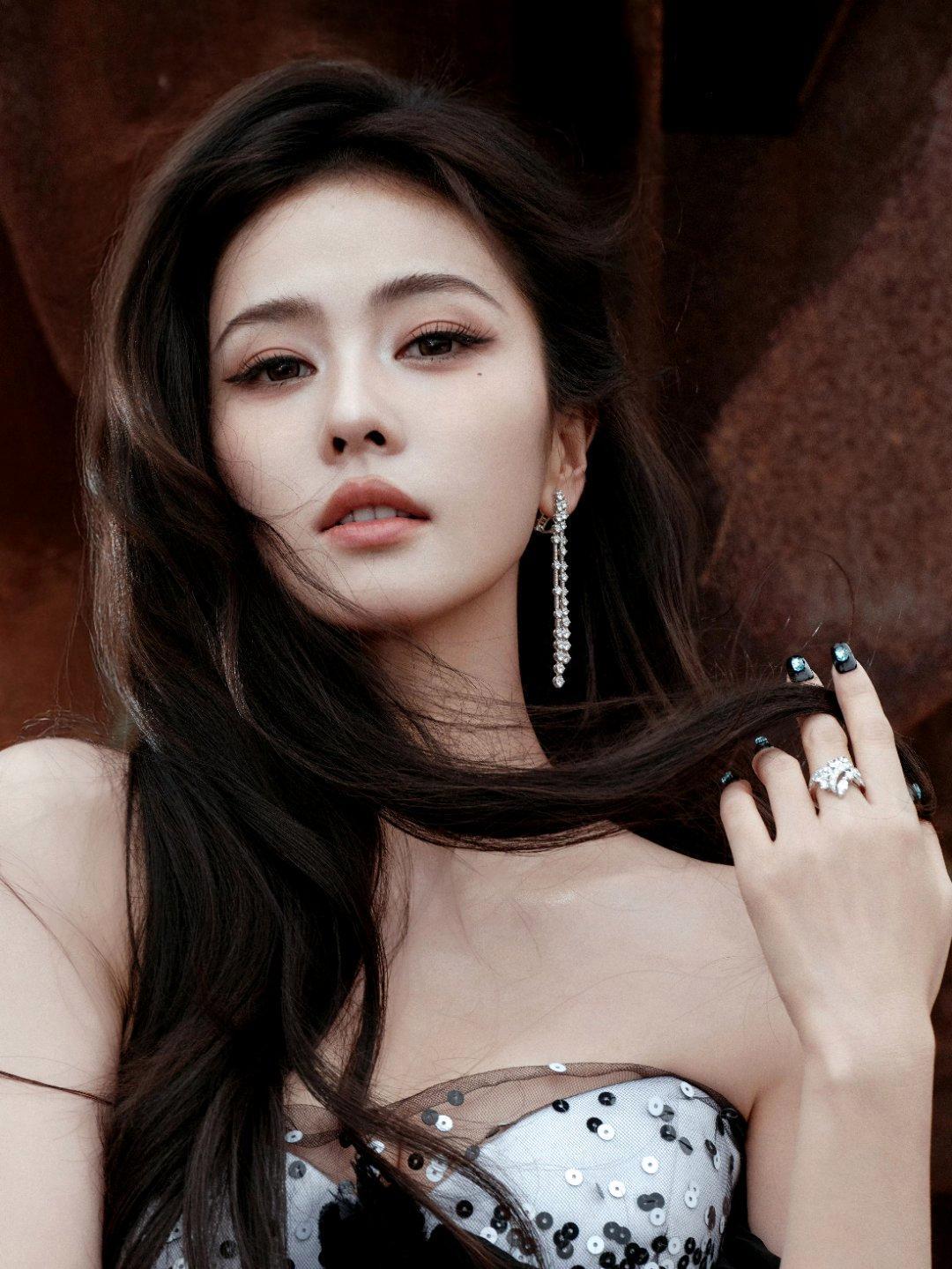 白鹿的这组写真直接把冷艳氛围感拉满!一袭黑白撞色亮片抹胸礼裙,开叉设计勾勒出修长腿部线条,blingbling的亮片在镜头下熠熠生辉,搭配流苏钻石耳饰,精致又吸睛。