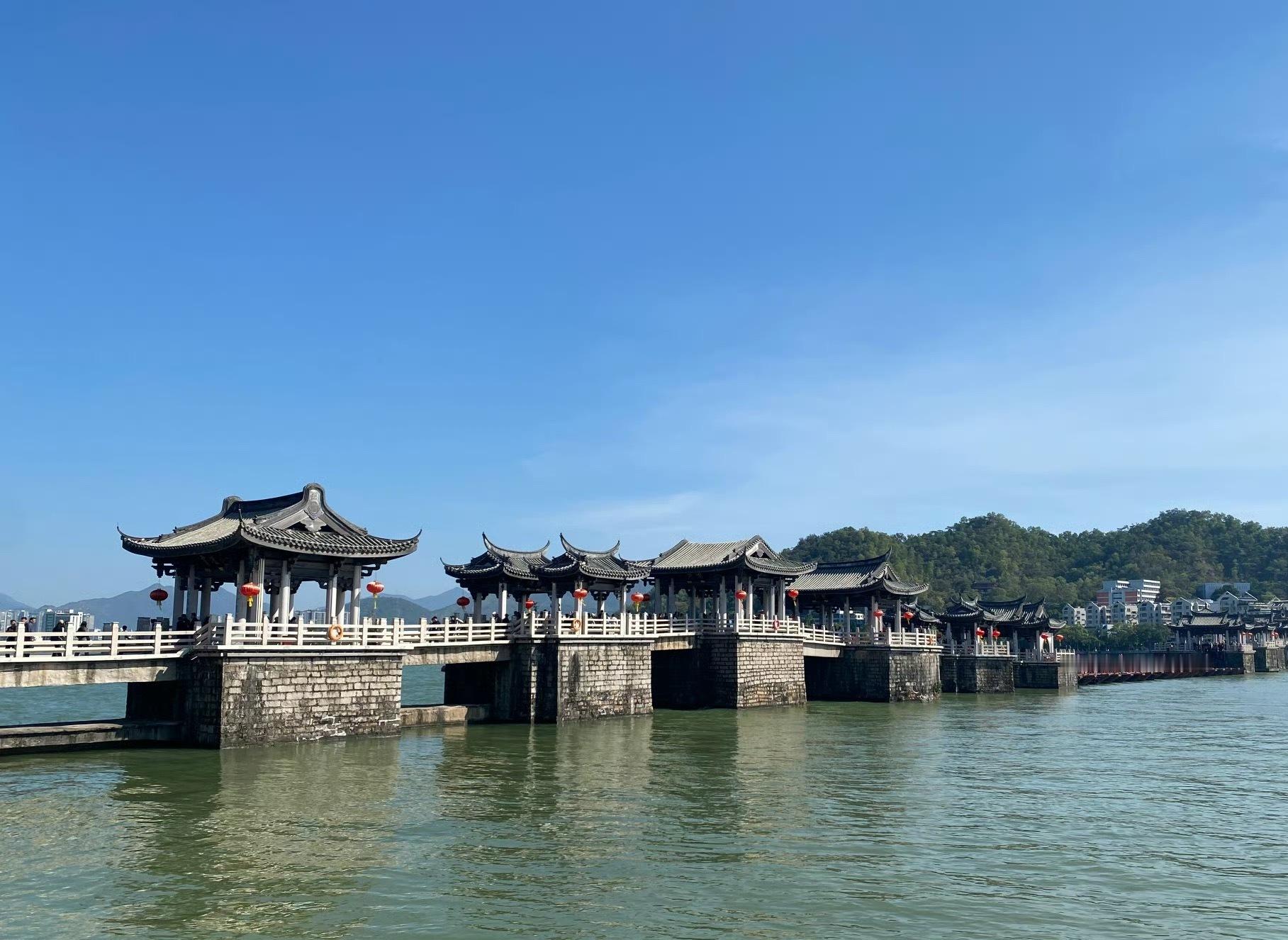 广济桥,中国四大古桥之一,中国四大名桥之一,被桥梁专家茅以升誉为“世界上最早的启闭式桥梁”。广济桥横跨韩江,集梁桥、浮桥、拱桥于一体,是潮州八景之一,是潮州文化的历史地标、全国重点文物保护单位!潮州有句名言,到广不到潮,枉费走一遭;到潮不到桥,白白走一场。足够说明广济桥在潮州的分量!每天上午九点连接东西桥墩的木船会连接在一起,使整个桥连接为一个整体。周一至周五下午五点,周末下午五点半,中间的木船会拆开,整个桥就断开了!这是不是就是现实版的过河拆桥。