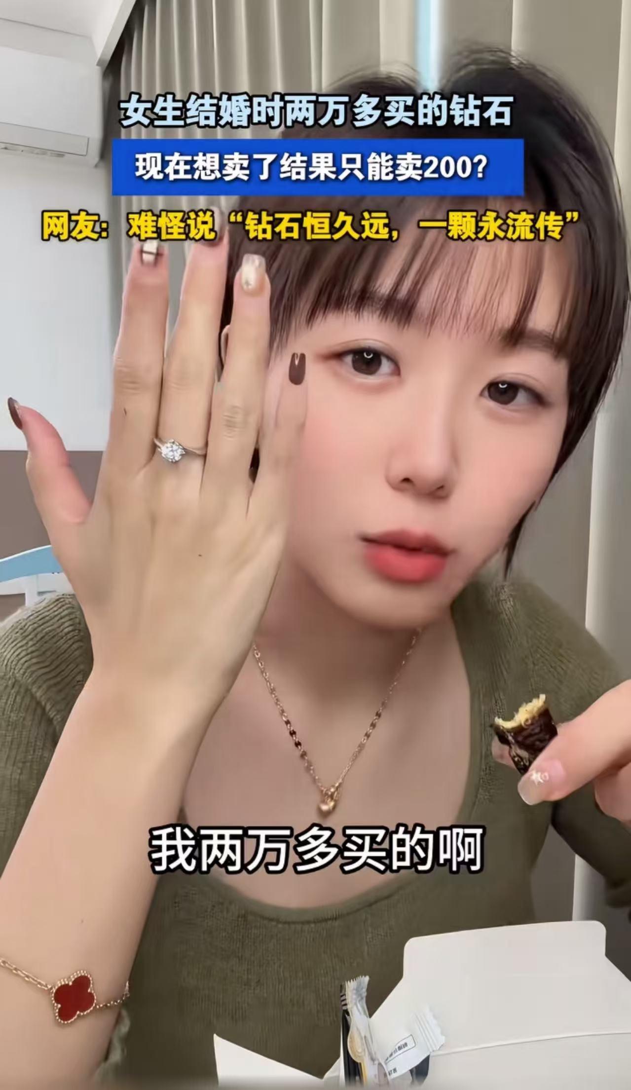 女子结婚时花两万多买的钻石戒指,现在想卖了,结果只能卖200块钱!女子:“这回我算是知道了,人家卖钻石的时候都告我去了,钻石恒久远,一颗永流传,为啥永流传?因为它卖不出去。” 结婚那会儿,女子看到身边的闺蜜们都戴着闪闪发光的钻石戒指,心里那叫一个羡慕嫉妒恨,觉得自己的结婚仪式要是没有这么一枚钻戒,那可就输惨了。 于是,她软磨硬泡,非得让老公给她买一枚。老公虽然心里有点肉疼,但为了让她开心,还是咬咬牙,花了两万块钱给她买了一枚。 那钻戒在灯光下扑闪扑闪的,亮晶晶的,把女子美得不行,心里别提多满意了。 可这世道变化快啊,后来黄金价格一路上涨,大家又开始流行戴黄金戒指了。女士看着别人手上金灿灿的戒指,又动了心思,想着把钻石戒指卖了,换个黄金的戴戴。 于是,女子兴冲冲地来到珠宝店,询问钻石戒指的回收价格。可店家给出的价格,让她瞬间像被泼了一盆冷水,从头凉到脚。 店家轻描淡写地说:“你这戒指,我们只能给200块钱回收。能给这个价,还是因为你戒指的圈是铂金的,要是没有这铂金圈,这钻石啊,一分钱都不值。” 女士听了这话,肠子都悔青了,心里直犯嘀咕:“早知道当初结婚就买黄金戒指了,放到现在,价格都不知道翻了多少倍了!” 她越想越觉得憋屈,就把自己的这段经历发到了网上,还苦口婆心地劝其他女生:“千万别像我一样傻乎乎地去买钻石戒指了,什么‘钻石恒久远’,这根本就是一个从头到尾的大骗局!” 此事引发热议,有网友说,我跟你一样,那时候我妈我婆婆非要我买黄金,我就是不要,买了一套铂金的花了三万多,现在后悔死了,一分钱不值。这就叫不听老人言吃亏在眼前! 也有网友说。不可能,2万多买的不可能只卖200,除非你被骗了买的河南产的莫桑钻,还有买这玩意就不是为了卖,只是一种可以传承的象征! 还有网友说,2015年结婚,我也要钻戒,老公说买黄金行不行?我妈也说黄金保值,当时金价300左右。我说不行,非得要钻戒。结果就结婚戴了几天,上班没法戴,一直放家里吃灰。如果当时买的黄金,现在两万应该变六万了,每次想到都想抽自己一个嘴巴子。 其实啊,这“钻石恒久远”的骗局,说白了就是商家精心炒作包装出来的。他们把钻石和爱情强行捆绑在一起,利用人们对爱情的向往和追求,把钻石的价格炒得高高的。 可实际上,钻石除了好看一点,根本就没有那么高的价值。爱情是纯粹而美好的,不应该被这些虚头巴脑的东西所绑架。我们在追求爱情和幸福的时候,还是要保持清醒的头脑,别被商家的花言巧语给忽悠了,不然最后吃亏的只能是自己!