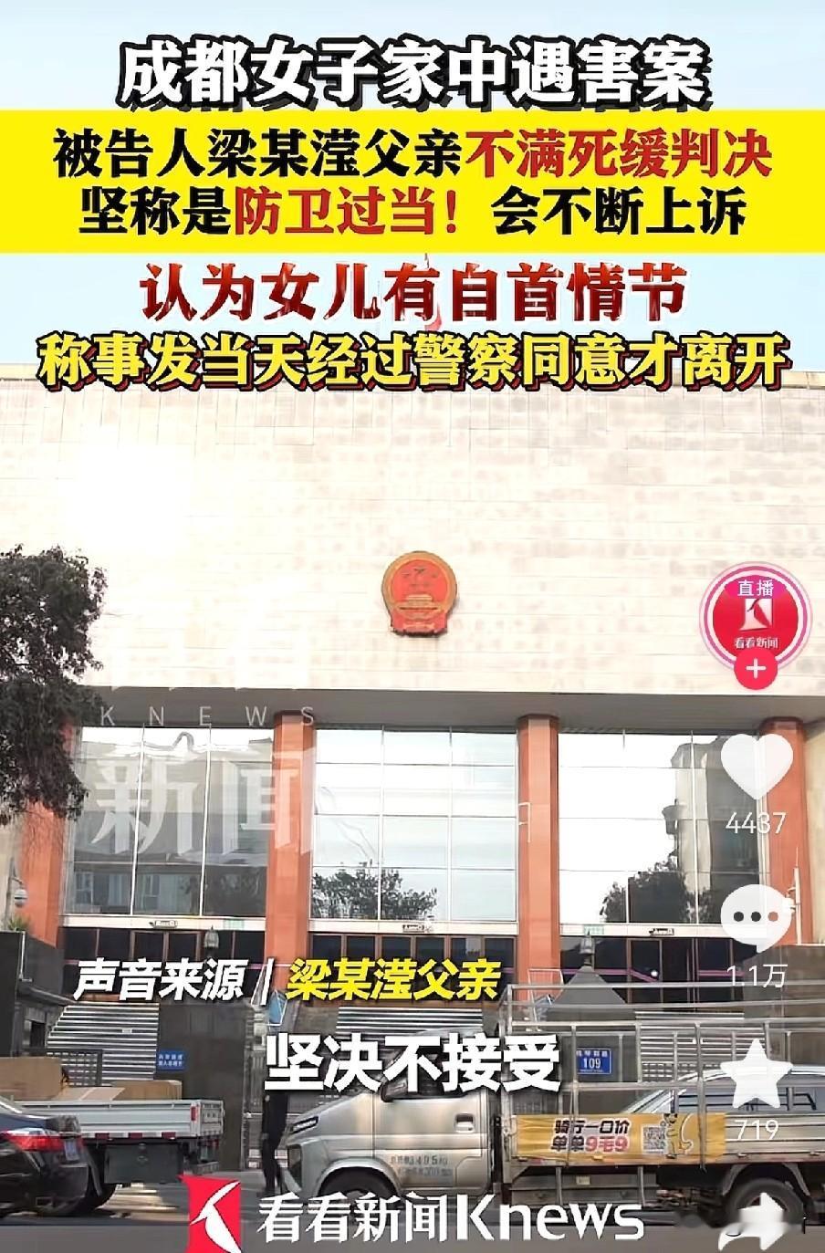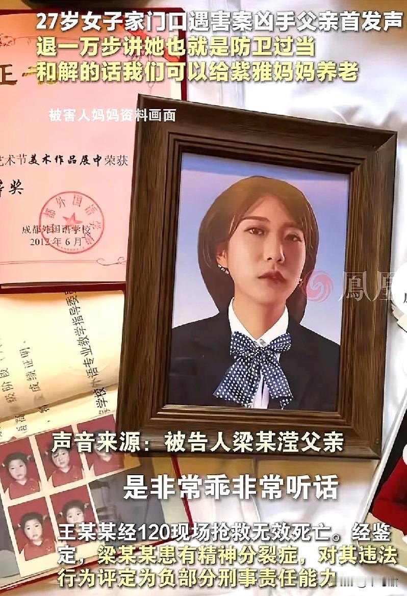 成都女子“家中遇害案”,没想到被告人梁某滢的父亲近日来首次发声了,他说“坚决不接受这个结果,他这后半辈子,就为这件事活下去”。 他表示他一定要向各个机关提起申诉,女儿梁某滢就是正当防卫,最多属于防卫过当了,且有自首的诚意,为什么会被法院拒绝,他觉得太可笑了。如果能和解,他们愿意适当的给予补偿,给紫雅妈妈养老。 他一次次强调是被害人王紫雅先动手打人,打的她满头是血,她认为对方是坏人才有了过激行为。可事实真是这样的吗?这番说辞看似满是对女儿的维护,却与法院审理查明的事实严重相悖。根据案情细节,案发当日是梁某滢在小区内无故敲门滋扰,甚至在紫雅家门口吐痰,紫雅无奈联系保安后,才开门与其理论。 在这位父亲眼里,女儿梁某滢非常听话乖巧,还乐于助人。甚至还说,如果当初知道楼道里有紫雅这样异常的女人,一定会提前跟女儿说,千万不要去招惹她。还说自己女儿从来没有主动攻击别人的行为,他们也觉得不可思议。 这起悲剧的发生,本就源于梁某滢长期异常行为未得到有效管控。如今梁父的发声,没有反思,没有真正的歉意,只有对事实的歪曲与对法律的质疑。这位父亲的首次发声,只想说一句,有其父必有其女啊。 (图片来自网络视频)