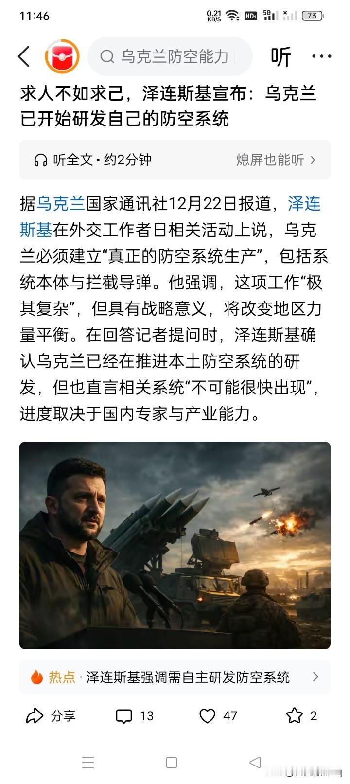 乌克兰要走上军事强国之路? 乌克兰在这场战争中面临的无论两个主要问题,一是抵抗俄罗斯军队的地面进攻;二是拦截防止俄罗斯的空中袭击。 对于俄罗斯军队的地面进攻,现在似乎基本上问题不大,因为俄罗斯军队经过长时间的进攻,并没有实现全部占领乌克兰东部四州,就是连占领顿涅茨克一个完整州的目标,目前看来也是困难重重,可望不可及。 而在防空武器装备方面,除了乌克兰自己研制出了部分拦截无人机的无人机外,几乎所有防空武器系统都是外国援助或购买的,而且数量目前并不能满足乌克兰的需要。 就是在这种情况下,12月22日,乌克兰总统泽连斯基表示,乌克兰将要研制和生产自己的防空武器系统,当然,泽连斯基也非常清楚,这并非一时半会儿的事情。但是,只要乌克兰努力去做,才有可能成功。乌克兰好像已经研制成功在战前就是连想象也不敢的远程巡航和弹道导弹,并且研制出多种性能各异的无人机,估计研制出来自己的防空导弹系统,大概也是迟一点早一点的事情。 总之,战争之后,乌克兰很可能以一个崭新的面目站在世界上。