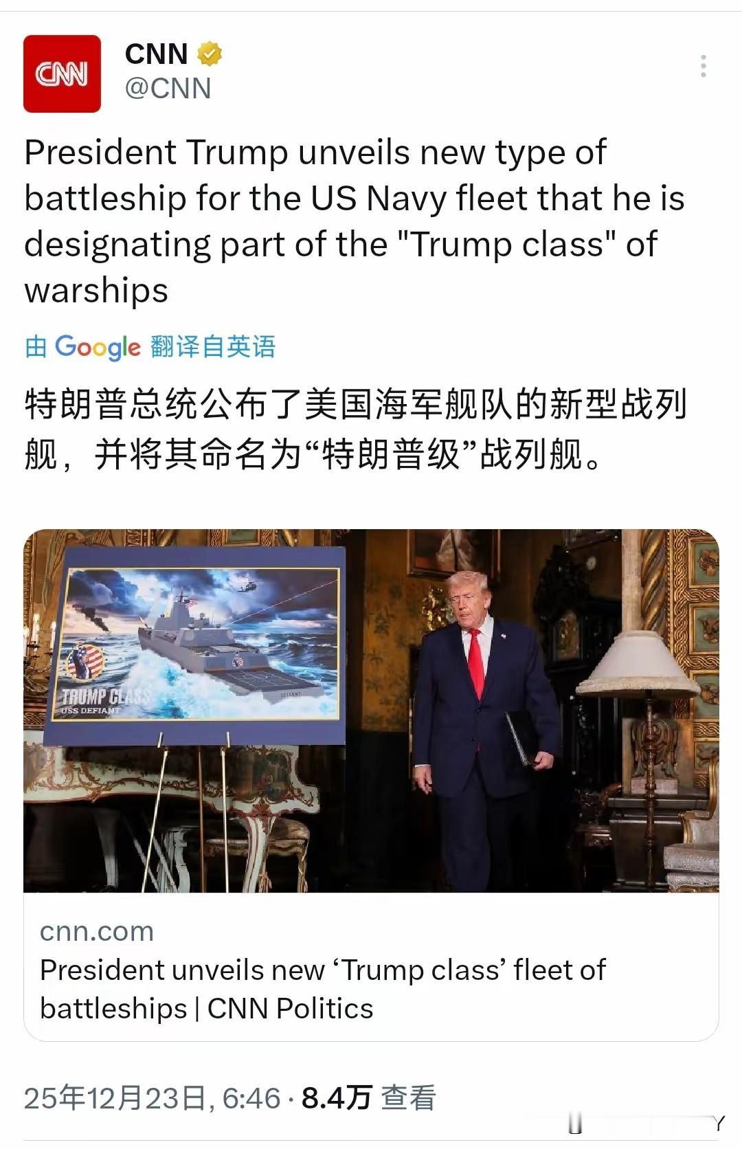 好大喜功的闹剧!据CNN12月23日报道,一场充满特朗普个人主义色彩的新闻发布会,于当地时间12月22日在佛罗里达州海湖庄园拉开帷幕。 美国总统特朗普携手国防部长赫格塞思现身台前,抛出一则重磅消息:美国海军即将开建两艘全新战舰,这两款战舰被冠以极具个人标识的名号——“特朗普级”。 特朗普更是在发布会上高调宣称,这将是美军序列里“最快、最大的战舰”,综合战斗力更是能碾压现有舰艇,达到“强大百倍”的惊人水准。 明眼人都能看得真切,特朗普这波操作,简直是将好大喜功、自我标榜的本性展露无遗。将海军新型战舰以自己的名字命名,这般举动哪里是真心实意为美国海军的发展添砖加瓦,分明是借着国防建设的名头,满足自己那膨胀到极点的虚荣心。 要知道,海军舰艇的命名向来有着严谨的规矩和深厚的内涵,或是纪念英雄人物,或是彰显地域文化,或是承载战略寓意。可“特朗普级”这个名字,除了直白地贴上总统的个人标签,看不出任何提振军心的价值。 它既不能让海军将士们心无旁骛地投身保家卫国的事业,反倒给庄严的国防建设平添了几分荒诞色彩,沦为外界茶余饭后的谈资。说起战舰的定位,特朗普特意提及“战列舰”这个充满历史感的词汇。 战列舰三个字,本身就裹挟着沉甸甸的历史情绪价值。它曾是大舰巨炮时代的海上霸主,是昔日列强彰显海上霸权的象征。在航母称霸海洋、导弹决胜千里的当下,特朗普却执意把这个复古的概念重新搬出来,还要亲自为其冠名,这番操作背后的心思昭然若揭。 他想要唤醒的,从来都不是契合未来战争形态的作战理念,而是美国曾经叱咤风云、无可争议的海上霸权记忆。在他的构想里,“特朗普级”战舰就该像当年的战列舰一样,成为美国威慑全球的海上利器,成为他任期内彰显政绩的标志性符号。 可理想很丰满,现实却很骨感。历史的车轮滚滚向前,从来不会因为一个响亮的名字就倒转回头。特朗普大可以将战舰的吨位无限放大,让设计团队画出炫酷无比的渲染图,也能把新闻发布会办得热血沸腾、燃爆全场。 但他似乎忘了一个最基本的事实:现代海战早就告别了单纯比拼吨位和火力的时代,从来不相信虚无缥缈的情怀。如今的海上战场,是信息化主导的战场,是体系化对抗的战场。 一艘战舰的战斗力强弱,取决于舰载雷达的探测精度,取决于导弹的突防能力,取决于舰艇的隐身性能,更取决于它能否融入整个作战体系,与航母、潜艇、战机形成高效协同。 单靠“最快最大”的噱头,单靠一个充满个人色彩的名字,根本不可能让战舰的战斗力实现百倍跃升。这种脱离实际的浮夸宣传,说到底不过是一场自欺欺人的表演。 放眼全球海军发展的趋势,各国都在朝着智能化、隐身化、无人化的方向深耕细作。无人舰艇的广泛应用,高超音速导弹的上舰部署,网络中心战的持续完善,这些才是决定未来海上话语权的核心要素。 特朗普妄图靠着冠名新型战舰来重温霸权旧梦,这种做法不仅偏离了海军发展的正确轨道,更暴露了他对现代战争规律的无知。他以为靠着一场声势浩大的发布会,靠着几句夸大其词的口号,就能重振美国的海上雄风。 殊不知,真正的军事强大,从来不是靠炒作和标榜得来的,而是靠日复一日的技术攻关,靠脚踏实地的装备研发,靠科学合理的战略规划。“特朗普级”战舰的横空出世,更像是一场政治秀。 它的诞生,与其说是为了增强美国海军的作战能力,不如说是为了服务特朗普的个人政治诉求。在选举政治的逻辑里,这样一个极具辨识度的国防项目,无疑能成为他拉拢选票、彰显强硬形象的利器。 可对于美国海军而言,这样一艘被赋予了太多政治意义的战舰,究竟能在未来的战场上发挥多大作用,恐怕要打上一个大大的问号。现代海战的残酷现实告诉我们,虚名换不来胜利,噱头赢不了战争。 特朗普的这场冠名闹剧,或许能在短时间内吸引全球的目光,能让他收获一波支持者的欢呼。但当喧嚣散去,留下的可能只是一个华而不实的海上玩具,一个被钉在历史耻辱柱上的笑柄。 毕竟,在实力为王的国际舞台上,任何脱离实际的自我标榜,最终都只会沦为世人的笑谈。