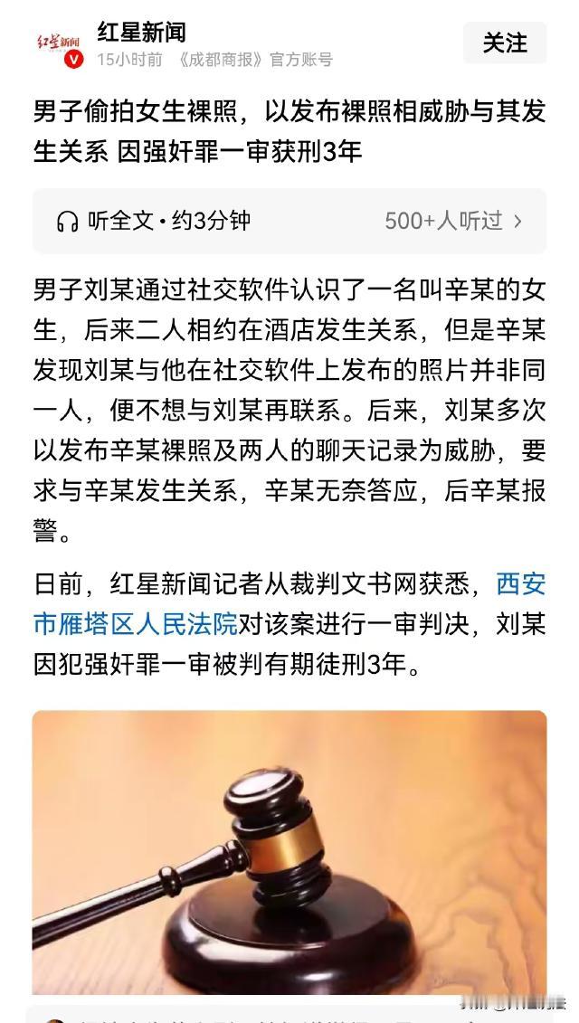 陕西西安,女生和人网恋,见对方长得帅,便答应和他奔现开房,见面后,女生发现对方是不是照片本人,还与他发生了关系。事后男子以公开二人聊天记录相威胁,要求女生继续和他发生了关系。女生无奈答应,结果又被男子拍下了裸照,对方再次以此威胁,女生忍无可忍报了警。 据红星新闻等报道,辛某是一名青春靓丽的女大学生,2024年6月,辛某无意间认识了一名网友刘某。 辛某和刘某很聊得来,没几天两人就打得火热。刘某提议二人互爆照片,辛某自认长得漂亮,对此毫无心理负担,一张精修图甩过去,刘某心动不已,也发了一张自拍。 辛某一看,刘某长得阳光帅气,身材也非常挺拔,完全就是自己的理想型。 互爆照片后,两人聊的更火热了,还经常聊一些成年人之间的暧昧话题。 过了几天,刘某就开始约辛某见面,并提出想和她发生了关系。辛某对照片上的刘某非常心动,答应赴约。 6月26日,刘某在雁塔区某酒店开好房,辛某打扮一番后如约而至。 进入房间后,辛某发现刘某和照片上的不是一个人,但是她并没有拒绝刘某,仍旧和刘某发生了关系。 发生关系后,辛某觉得,刘某现实中虽然长得不丑,但和她的理想型还是有很大区别,便不想再和刘某继续了。 谁知,刘某一直联系她,还说如果辛某甩了他,他就把两个人的暧昧聊天记录和尹某的照片发到校园网里,让她没法做人。 辛某在刘某的威胁下不情不愿和他见了第二面,并且两人又发生了一次关系。 让辛某没想到的是,刘某这次早有准备,还偷偷拍下了辛某全 裸照片。 事后,刘某以辛某的裸 照再次威胁她,辛某意识到,自己的妥协只会换来刘某的变本加厉,于是,忍无可忍的辛某报了警。 刘某以为自己做的人不知鬼不觉,也以为捏住了辛某的把柄,谁知,没几天他就被民警抓获了,并因涉嫌强 奸 罪被提起公诉。 本案中,辛某在首次见面发现刘某与照片不符时未拒绝发生了关系,这一次,两人发生了关系, 属于你情我愿,并不涉及到法律。 但是,在辛某想和他断了联系时,刘某以聊天记录等相威胁,并以此再次和辛某发生了关系,此次,刘某构成强 奸 罪。 强 奸 罪的本质特征是违背妇女意志,即妇女不同意发生了关系,而行为人通过强制手段迫使妇女与其发生了关系。 辛某最初基于对照片上刘某形象的好感答应见面并发生了关系,首次见面虽发现刘某与照片不符但未拒绝,这一行为是其自主意愿的表达,但之后刘某的威胁行为改变了整个性质。 当刘某以公开二人暧昧聊天记录和辛某照片到校园网相威胁时,辛某的主观意愿已经发生了变化,她不想再与刘某继续联系,更不想再次发生了关系,但由于刘某的威胁,她不得不就范。 这充分表明,尹某和刘某后续发生关系的行为是违背辛某意志的。 刘某以公开暧昧聊天记录和照片到校园网相威胁,这对作为女大学生的辛某来说,无疑是巨大的精神压力,也正因为刘某的威胁,使得辛某不敢反抗。 “不敢反抗”是指妇女在面对行为人的威胁、恫吓等手段时,因害怕自身名誉、财产、人身等权益遭受损害,而不敢拒绝 性 行 为。 一旦这些内容被公开,辛某的名誉将受到严重损害,可能会面临同学的异样眼光、舆论的压力等,这使得辛某不敢拒绝刘某的要求,只能无奈答应再次见面并发生了关系。 之后刘某又以偷拍下的裸 照进行威胁,进一步加剧了辛某的恐惧和不敢反抗的心理。 虽然辛某在首次见面时未拒绝发生 关系,但这不能成为判断整个事件性质的唯一依据。 强 奸 罪的认定应综合考虑整个过程中妇女的意志变化以及行为人是否采取了强制手段。 刘某在首次发生关系后,通过威胁的方式迫使辛某再次与其发生了关系,这种行为已经超出了辛某最初的意愿范围,符合强 奸 罪中违背妇女意志的构成要件。 根据《刑法》第二百三十六条规定,以暴力、胁迫或者其他手段强 奸妇女的,处三年以上十年以下有期徒刑。 刘某以披露二人的聊天记录及辛某照片、裸 照等相威胁,这种威胁手段属于强 奸 罪中的“胁迫”手段。 通过这种胁迫,刘某违背了辛某的意志,强行与辛某发生了关系,其行为完全符合强 奸 罪的构成要件。 刘某后续以威胁手段迫使辛某再次与其发生了关系的行为,违背了辛某的意志,符合强 奸罪中“不能反抗、不知反抗、不敢反抗”中“不敢反抗”的情形。 庭审时,刘某辩解称,自己和辛某发生了关系是双方你情我愿,并不存在胁迫。 经审理认为,根据二人的聊天记录,可以相互印证,刘某确实多次以聊天记录和辛某的照片相威胁,逼迫辛某和他发生了关系,刘某构成强 奸 罪。 但因刘某获得了辛某的谅解,到案后如实供述有自首情节,且系初犯,可从轻处罚,判处其有期徒刑3年。