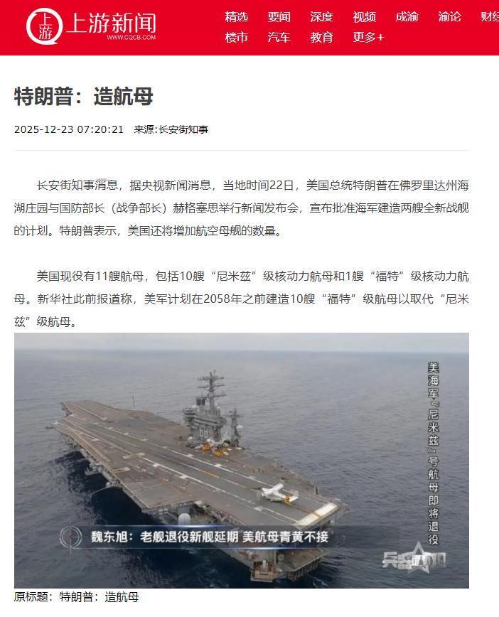 好家伙!手握全球半数航母的美国,竟还要疯狂“加购”!当地时间12月22日,美国总统特朗普在佛罗里达州海湖庄园,和国防部长一起开了场新闻发布会。会上他明确说,先造2艘新型战舰,之后逐步增加到20至25艘,这些战舰都会装上高超音速武器、激光武器这类先进装备。除此之外,美国现在还在造3艘大型航母。 特朗普还提到,下周要跟国防承包商见面,商量新建工厂的事儿,而且新战舰必须用美国产的钢铁。 很明显,特朗普这话不是随口说说的,核心就是想保住美国在海上的霸主地位。再看看美军现在航母的实际情况,确实得再多造几艘,这可不是空话,有实实在在的例子和数据能证明。 可能有人觉得,美国都有11艘航母了,占全球一半,够威风了吧?其实早闹“航母荒”了,这就是特朗普非要多造航母的关键原因。 就说最近红海不太平,美军为了对付胡塞武装,把西太平洋的“卡尔·文森”号航母紧急调过去,从东亚到中东得走两三周。 原本在红海的“杜鲁门”号早就该回家休整了,之前还跟商船撞过要修,根本撑不了多久。 西太平洋没航母了,只能把已经服役50年的“尼米兹”号拉出来凑数,这船早该退役了,就是因为新航母跟不上才硬撑。 之前2025年11月美军在加勒比海搞行动,能用的航母也没几艘,只能派“福特”号上。 这就能看出来,美军的航母根本不够支撑它在全世界到处忙活,特朗普多造航母,就是想补这个缺口,继续当“世界警察”。 为啥特朗普非要多造航母呢?其实他满脑子都是当老大的想法。航母对美国来说,就是移动的军事基地,哪儿有好处、哪儿闹事儿就往哪儿派。 比如2025年在加勒比海的行动,美军打着禁毒的幌子,把“福特”号开过去搞军事威慑,其实就是想压着拉美那边的左翼政府,控制当地的资源。 之前巴以冲突,美军一下子派两艘航母去东地中海,就是靠航母的威慑力稳住局面,保住自己在中东的利益。 这些事儿都说明,航母是美国保住全球老大地位的关键工具,特朗普多造航母,就是想在亚太、中东这些关键地方都能镇得住,不让自己的老大地位动摇。这种到处耀武扬威的做法,只会让各地更不太平,确实让人反感。 可能有人问,11艘还不够?关键是这些航母太老了。11艘里10艘是“尼米兹”级,都用了好多年了。 就说“尼米兹”号本身,1975年就服役了,按计划2020年就该退役,因为新航母跟不上,硬是要用到2026年,修修补补要花好多钱,战斗力还不一定有保障。 新的“福特”级航母造得也不顺利,首舰原本计划花80亿,最后花了130亿,2009年下水,2022年才第一次派出去,至今还没法装核心的隐形战机。 全美国就一家船厂能造超级航母,还同时要造3艘新航母、修1艘老航母,根本忙不过来,新航母交付一再推迟。 特朗普说造3艘新航母、建新车厂,就是因为现在造得太慢、产能不够,想赶紧补上老航母退役后的空缺,这也能看出来,他多造航母的计划是真要推进,不是喊口号。 但咱们得看清,核心还是为了保住军事霸权,多造航母才是最终目的。一艘“福特”级航母就花130多亿,后续维护、养兵、买战机还要花更多钱,造20多艘新战舰加3艘航母,是笔天文数字,对美国经济也是个大负担。 但特朗普不管这些,眼里就想让美国继续在全世界说了算,就算砸钱也要造,这种做法太不理智了。 不管是红海局势里航母不够用,还是“尼米兹”号超期服役,都证明美国确实需要多造航母支撑它的全球计划。 虽然造航母会超支、产能也跟不上,但特朗普政府肯定会推进,毕竟航母是它霸权的基石。 说实话,美国一门心思搞军事霸权、到处派航母,只会让各国都跟着搞军备竞赛,各地更不太平。 特朗普这决定说到底就是为了美国自己的利益,把自己的安全建立在别人的不安全之上,这种想法迟早会自食恶果。