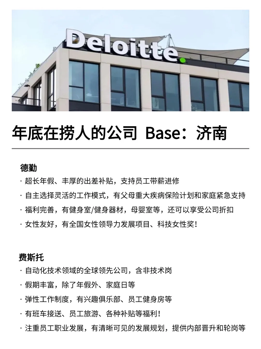 济南发展真的越来越好,有不少小而美、冷门宝藏的公司,机会是真的很多的! 特别是有不少小众冷门的外企,真心建议大家可以去试试 · 为什么还是值得去外企? ▪️氛围好,对女性友好,年假长,基本上都是10天起步 ▪️很多还都支持居家办公、福利完善,是真的能实现WLB ▪️待遇也还不错,想在年底找工作的真的可以考虑考虑~ · 坚持日更✊🏻,帮大家在找工作路上顺利拿 offer! ·
