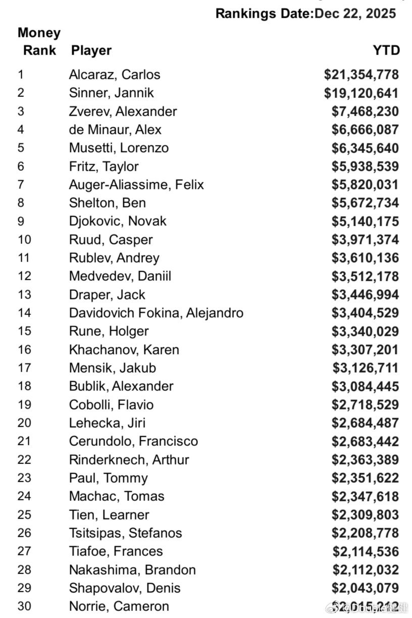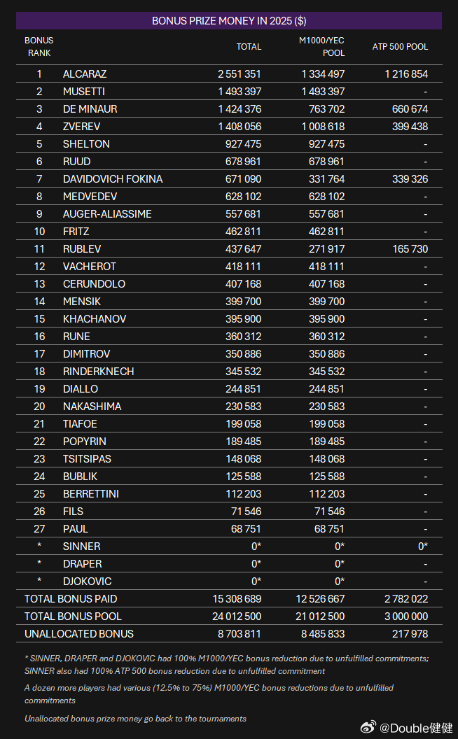今年ATP额外奖金公布(图一)阿尔卡拉斯、穆塞蒂、德米纳尔位居前三。今年ATP奖金榜(图二)阿尔卡拉斯、辛纳、兹维列夫前三。热点现场