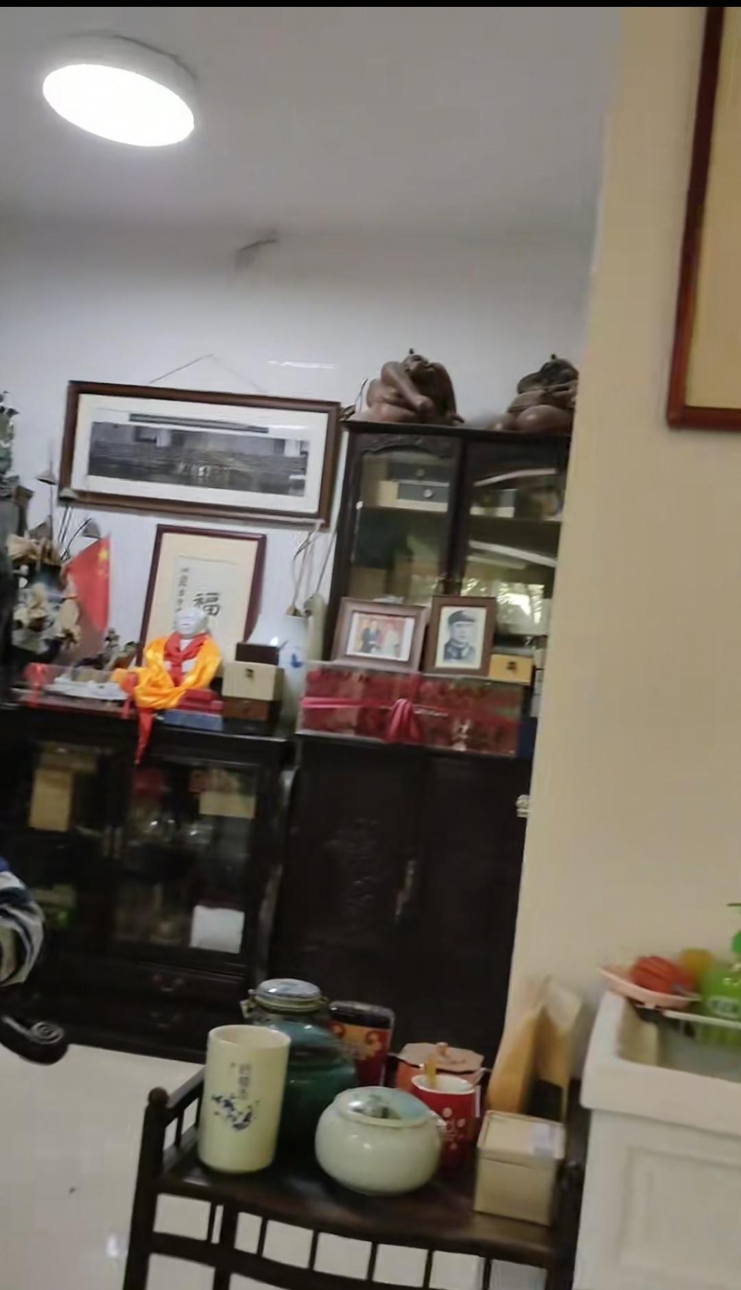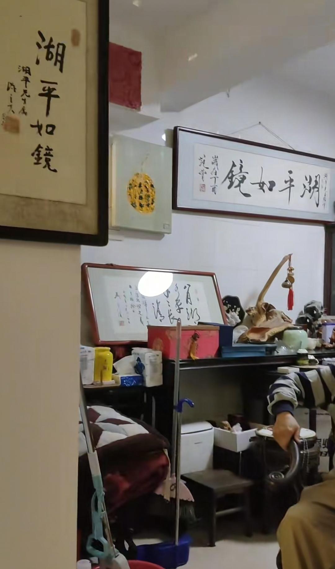 许院长祖籍是湖南平江县人,对老家人来说,那也是一种荣耀,老家人在2024年专门去拜访他。 许院长当时坐在椅子上,椅子是太师椅,家里空间很小,年龄大了,也不怎么收拾,但背后的一些古玩很显眼,堆放在桌子上,柜子里放的都是一些瓷器,甚至有有些古玩没有精美包装。 许院长家里的墙上有字画,有两幅字写的是“湖平如镜”。许院长住的地方,也放着打扫卫生的塑料簸箕扫帚,还有洗水池。家里的文玩也是自己珍藏的。