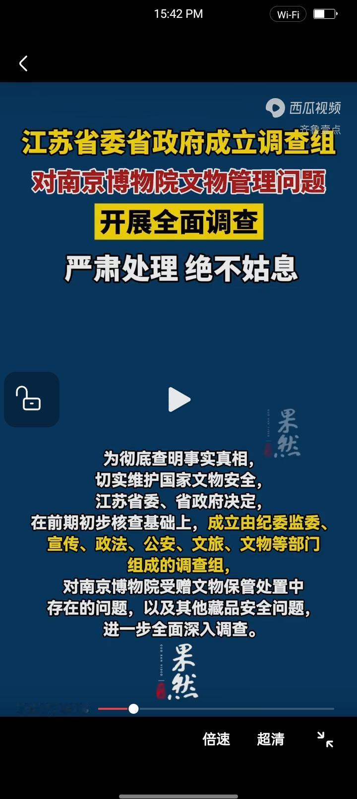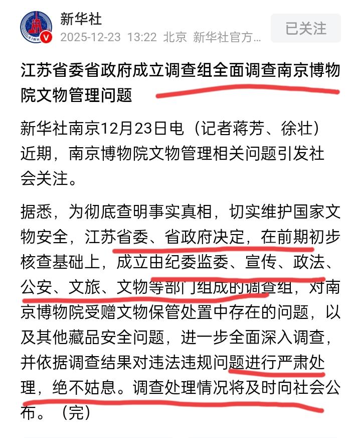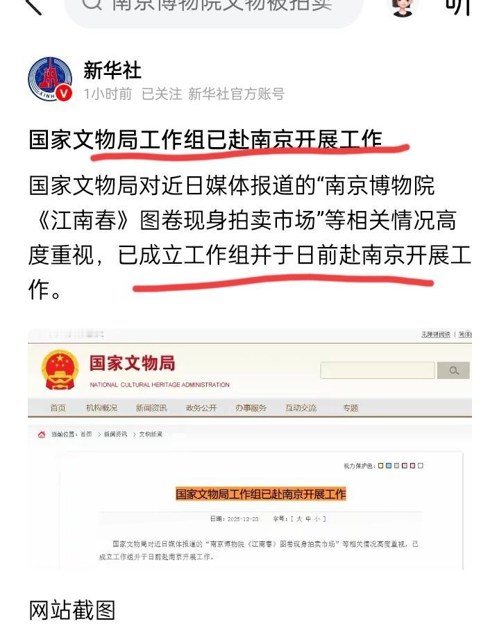 国家文物局, 江苏省由多部门成立联合调查组,其中就包括了纪委监委,还有公安两大部门!南京博物院文物事件正式被提级处理,这下子估计有人要瑟瑟发抖了吧! 如果大家有注意到联合调查组的表态,就知道这个事情闹了现在,必须要有人出来承担后果! “深入调查,严肃处理,绝不姑息”! 这12个字毫无疑问就已经表明了官方的态度,也证明这个事情也引起了上层的高度重视,毕竟文物属于国家的宝贵资源和财富,单单一幅字画拍卖的起步价就已经是8800万,我们无法想象究竟还有多少这样的珍贵文物,不知道怎么就外流了,所以必须要一查到底!南京博物院 南京博物馆拍卖 南京国家文物 国家文物保护法