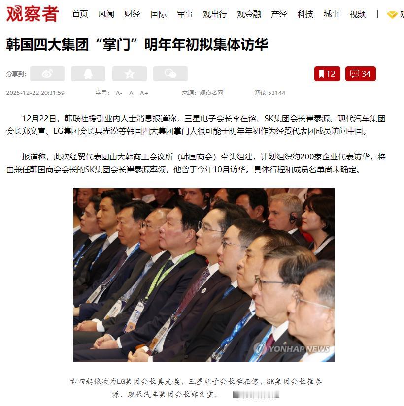 太不寻常了!韩国四大集团“掌门”竟要在明年年初集体访华! 12月22日有消息说