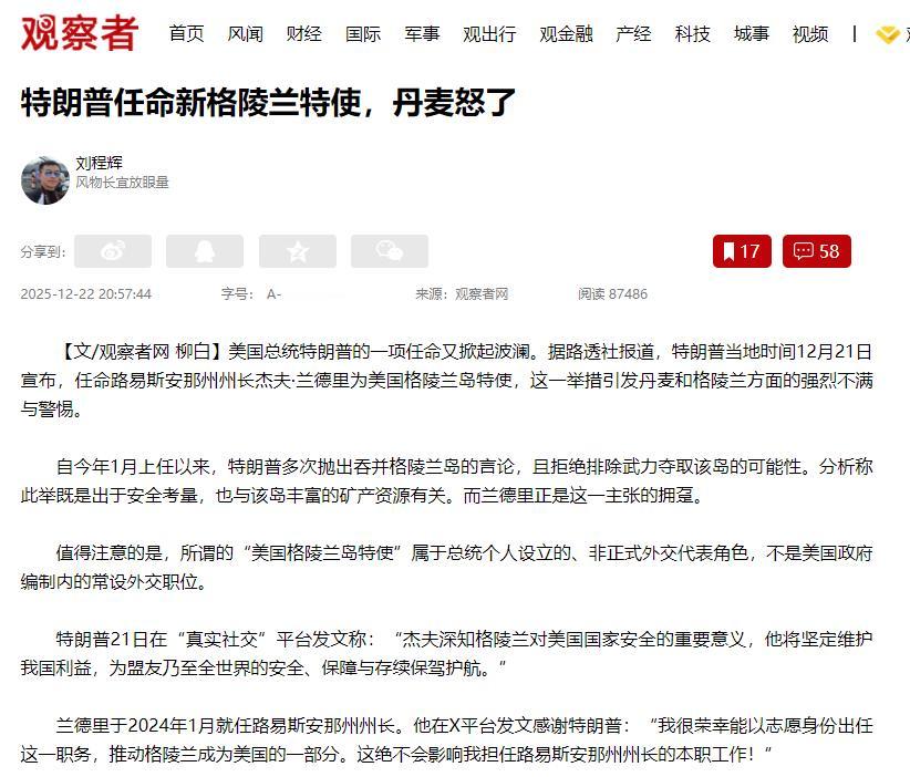 丹麦怒了!特朗普对格陵兰岛正式出手! 据媒体12月22日报道:最近国际上出了件让人笑话的事,美国的特朗普又瞎折腾——任命路易斯安那州州长兰德里当美国驻格陵兰特使。这一下直接把盟友丹麦惹毛了,全国上下都火大。 有人可能会问,不就是派个官吗?至于这么生气?其实这根本不是派官那么简单,背后全是美国的霸道心思,完全不把丹麦的主权当回事,换谁都得怒。 先跟大伙说清楚,格陵兰是丹麦的地盘,虽然自己管内部事,但外交、国防这些大事还是丹麦说了算,这是全世界都认可的规矩。 结果特朗普任命特使,压根没跟丹麦商量,直接绕开丹麦找格陵兰,这就是明着挑衅。 更过分的是,新特使兰德里一上任就说,要推动格陵兰变成美国的一部分,这跟明抢地盘没区别,丹麦能不火? 为啥美国非要盯着这么个又冷又偏的地方呢?因为这地方全是宝贝,位置还特别关键。 美国早就查清楚了,格陵兰有150万吨稀土,这数大得吓人,手机、新能源汽车,还有美国造导弹都离不开这东西。 除此之外,地下还有好多没开采的石油和天然气。而且现在天气变暖,格陵兰的冰化了,这些宝贝都能挖了,特朗普能不眼馋? 除了宝贝多,格陵兰的位置也很重要,卡在北极航道的关键地方。现在北极的冰化了,走这条航道从美国到欧洲能少走几千公里,不管做生意还是调兵都方便。 过去10年,走这条道的船多了37%,价值越来越高,美国早就想在这插旗了,控制了格陵兰,就等于在北极站稳了脚。 而且这不是特朗普第一次打格陵兰的主意了,今年1月上任后,他就三番五次说要“得到”格陵兰,甚至说不排除用武力抢。 当时丹麦就很不满,还专门派人盯着他的动向。这次特朗普直接跳过丹麦任命特使,还找了个想吞并格陵兰的人,简直是往丹麦伤口上撒盐。 丹麦首相、外交大臣都直接表态,说格陵兰不卖,美国这做法不能接受,还要召见美国大使。欧盟也站出来帮丹麦,说领土完整是规矩,不能随便破坏。 其实美国是丹麦的盟友,可特朗普为了自己的好处,完全不管盟友感受,突破了外交底线。 说到底,特朗普这操作就是霸道,格陵兰人才5.7万,就想安稳过日子,却被美国当棋子。丹麦愤怒就是为了护自己的地盘,反抗美国的霸道。 国际社会都看在眼里,领土完整是规矩,不是美国想怎样就怎样。特朗普这么折腾,只会搞僵和丹麦的关系,遭更多国家反对,丹麦的愤怒,也是很多国家想说的心里话。