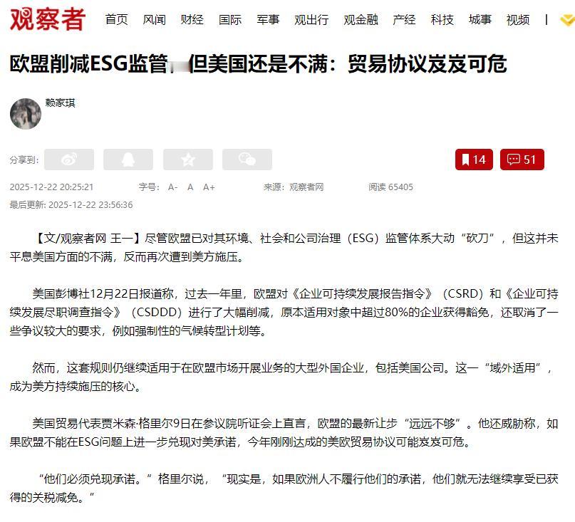 就差最后一步!欧盟已经没有退路了! 最近美欧之间有件事儿特别让人费解:欧盟把自己的ESG监管规则砍得差不多了,几乎是妥协到底了,结果美国还是不买账,反而变本加厉施压,甚至放话要掀掉刚达成的贸易协议。 这可不是小事,直接关系到美欧这对老盟友的贸易关系能不能稳住,说白了,现在这贸易协议已经悬在悬崖边上了。 先跟大伙儿说清楚,ESG就是让企业做生意守环保规矩、善待员工、管理规范。 之前欧盟搞了两个挺严的指令,一个叫CSRD,一个叫CSDDD,要求企业公开环保相关信息,还得盯着整个供应链的环保和人权问题,违规就重罚。 但这两年欧洲经济不行,企业都喊扛不住合规成本,欧盟没办法,只能硬着头皮砍这些规则。 这次削减可不是小打小闹。按美国媒体12月22日的报道,过去一年里,原本要遵守这两个规则的企业,超过80%都不用遵守了,大部分企业直接松了绑。 像之前要求企业必须做气候转型计划这种有争议的条款,也直接取消了。具体来说,之前很多大小企业都要交报告,现在只要求1000个员工以上、年营业额超5000万欧元的大企业交。 另一个指令更夸张,实施时间推到2028年,罚款也降了,还取消了必须终止违规供应链合作的要求。 说句公道话,欧盟这让步够彻底了,差不多把监管的架子都拆光了,就是想让美国满意,保住两边的贸易合作。 可没想到,欧盟都让到这份上了,美国还是不依不饶。核心问题就出在“域外适用”上,欧盟虽然豁免了大部分本土企业,但在欧洲做生意的外国大企业,还得遵守这些规则,这里面就包括很多美国大公司。 在美国看来,这就是故意针对他们,搞不公平竞争,根本咽不下这口气。 比如美国能源巨头埃克森美孚,在欧洲有不少业务,按现在的规则还得遵守,他们CEO就放话了,说规则太苛刻,不改就退出欧洲市场。 还吐槽欧盟管得太宽,不仅管欧洲的业务,连跟欧洲没关系的全球业务都想管,违规了可能要罚近100亿美元,相当于好几个月的利润。 除了这家公司,美国商会还牵头很多企业给国会写信,说这是越权,侵犯美国监管主权,还会让美国企业丢工作、少赚钱。 美国政府更直接,贸易代表在听证会上说欧盟的让步远远不够,还威胁说要是不兑现承诺,今年刚达成的贸易协议就危险了,之前答应的关税减免也泡汤。 商务部长也说要报复,国会还在推法案阻止这规则实施,明摆着就是逼欧盟彻底放弃对美国企业的监管要求。 有人可能会问,不就是个监管规则吗,至于撕贸易协议?还真至于。今年7月底美欧刚达成协议,欧盟承诺不阻碍跨大西洋贸易,美国才同意把对欧盟商品的关税上限控制在15%。 美国就是算准了欧洲经济依赖对美贸易,才拿协议威胁。要知道美欧每年贸易额好几万亿美元,协议黄了,关税涨了,企业撤资了,两边经济都得受重创,尤其是欧洲经济本来就弱,真打贸易战后果不堪设想。 可欧盟现在也退无可退了,有欧洲议员说现在的规则已经是底线了,要是连外国企业的要求都取消,不仅不公平,在欧洲议会也通不过。 欧盟也强调,规则就是让所有在欧洲做生意的企业站在同一起跑线,没歧视,没让步空间了。 说到底,美国这就是得寸进尺。欧盟都把监管砍得只剩核心条款了,就为了照顾美国,结果美国还揪着不放,本质就是想让美国企业在欧洲随便赚钱,不用承担环保和社会责任成本。 美欧本来就矛盾多,这事儿更是火上浇油。现在就看两边能不能谈拢,要是美国继续逼,这贸易协议大概率保不住了,对两边老百姓和企业都是灾难。美国这种只顾自己利益、破坏合作的做法,真不是大国该有的样子。