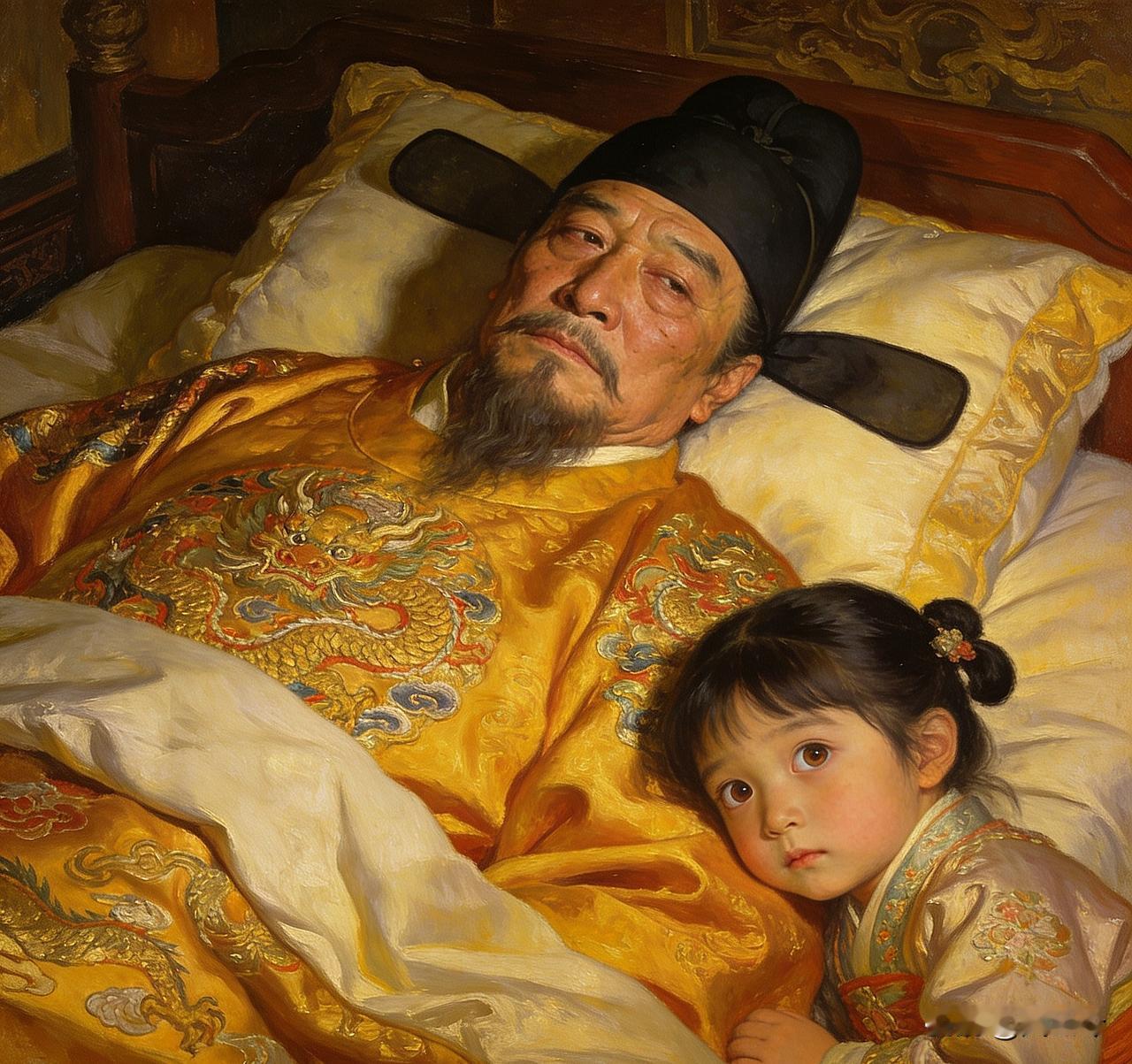 洪武三十一年春,71岁的朱元璋病入膏肓,前来请安的大臣与妃嫔来来回回就一句话“陛下万寿”,没一句真心话,直到这天,宝庆公主来了。 她牵着母亲张美人的手,蹒跚着走了进来。宝庆是朱元璋六十多岁后才得的幺女,今年刚满三岁。 她跑到榻前,伸出软乎乎的小手,握住了父亲枯瘦冰凉的手指。 “父皇,你怎么了呀?”奶声奶气的一句话,像一颗小石子,投入朱元璋死水般的心湖。 他难得地缓了脸色,沙哑道:“父皇病了。你看,我会好么?” 一旁的张美人早已吓得魂飞魄散,指尖冰凉。她生怕女儿童言无忌,触了逆鳞。 可小宝庆只是歪着头想了想,随即绽开一个灿烂的笑脸:“父皇没事!囡囡生病,吃了药,睡一觉就好啦!父皇也睡觉,明天就好啦!” 孩子天真笃定的逻辑,让朱元璋紧绷的嘴角竟扯动了一下,他摸着女儿细软的头发,心底那点属于“父亲”而非“皇帝”的柔软,被轻轻触动了。 “傻囡囡,”他低叹,“父皇不是睡觉,是要去很远的地方了。” “很远?”宝庆眨着眼,回头看看母亲,又转回来,小手紧紧拉住父亲,“那我和娘陪父皇一起去!父皇就不怕啦!” 童言无忌,听着女儿要用稚嫩的肩膀为他壮胆,那股久违的暖意烫得他眼眶发酸。他笑着摇头:“你不要去。你要好好长大。” 或许是母亲眼中克制不住的悲恸,宝庆愣愣地看着父亲,又看看母亲,“哇”地一声,毫无预兆地大哭起来。 就是这毫无伪饰的眼泪,冲垮了帝王心中最后一道名为绝对规则的堤坝。 他看着哭得上气不接下气的小女儿,又看向面如死灰、紧紧搂着孩子的张美人。那一刻,他不是洪武帝,只是一个垂死的父亲。 “罢。”极轻的一个字,却重逾千斤。 一个月后,洪武皇帝驾崩。遗旨颁下,四十六位妃嫔并侍疾宫女,悉数殉葬。唯有张美人宫中,悄然撤下了所有素白。 她紧紧抱着懵懂的宝庆,女儿那天真一笑、嚎啕一哭,竟成了她绝境中唯一的盾牌。 后来宝庆公主的命也很好。先是侄子建文帝照顾她,后来四哥朱棣夺了皇位,居然也对她特别好,把她当亲女儿养,还给她挑了门好亲事,风风光光嫁了出去。 所以说,有时候孩子的天真,才是这世上最有力的东西。宝庆公主三岁时的一句关心、一场大哭,不仅救了妈妈的命,也改变了自己的命运。这个故事听着像传说,却是真真切切写在史书里的。 宝庆一生历经五朝,备受尊荣,平安终老。史书关于她的记载不多,只道是“公主幼,得免其母张氏殉葬”,而后便是屡受恩赏。 它告诉我们,再坚硬的权力,再冷酷的规则,有时候也抵不过人间最纯粹的那点亲情。