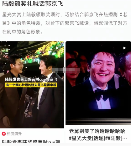 原来大家都错怪他了。 陆毅颁奖礼突然喊话郭京飞, 其实真的不是为了活跃气氛,最根本的原因是他打心底里把郭京飞当家人。 ​他在台上说家庭里有个像张建国那样细心护短的姐夫多幸福,还特意问郭京飞是不是,这哪是随便开玩笑,明摆着是拿自家日子当例子唠。 ​郭京飞在台下笑得前仰后合,事后还一起发合照,要真是没交情的,谁能这么自然接梗,这不就是亲戚间的热乎劲儿嘛。 ​谁家亲戚能在颁奖礼上这么掏心窝子说话,不就是打心底里亲吗?