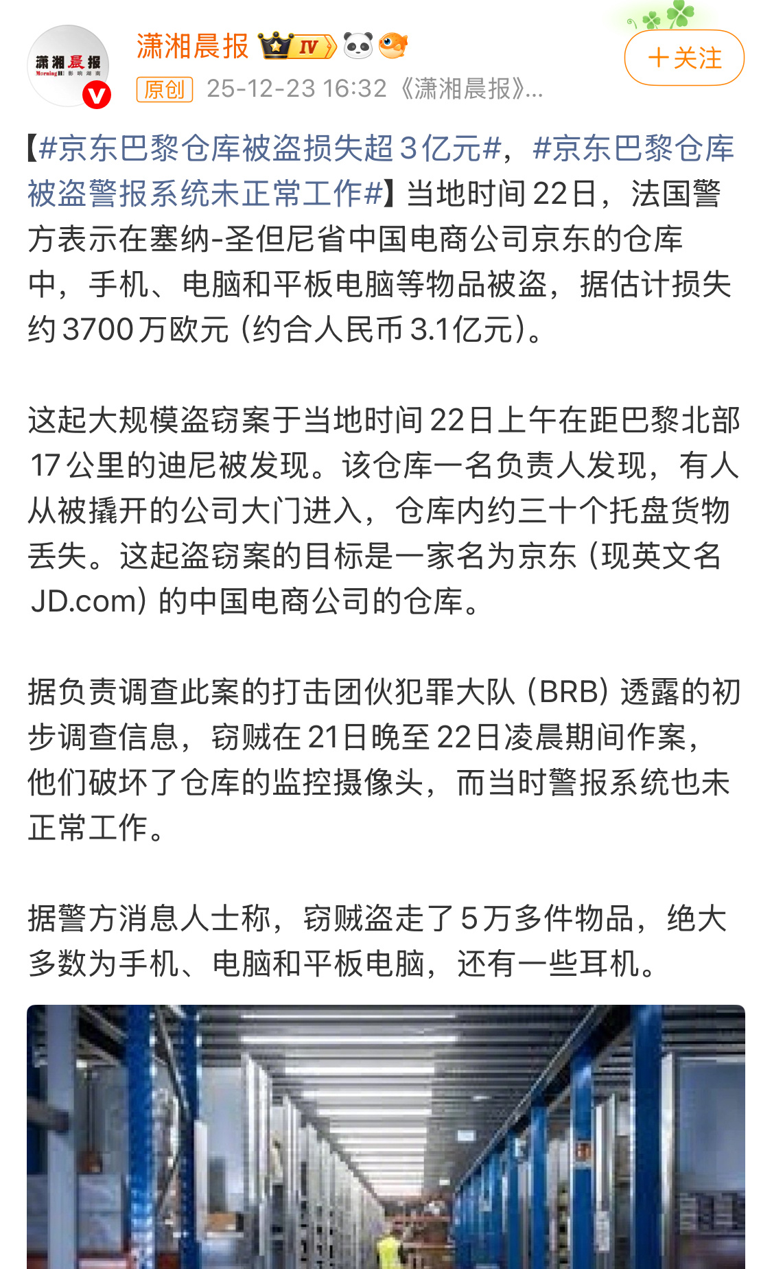 京东在巴黎的仓库,被小偷给端了?据媒体报道,总共50456件荣耀、OPPO设备被盗,其中大部分是手机、电脑和平板,初步预估损失约3700万欧元。这么大个仓库,周末没人值班?不知道是不是有内应,不然小偷都不知道该偷什么。好奇这么多东西,销赃是个大问题,要抓人线索应该也不少。