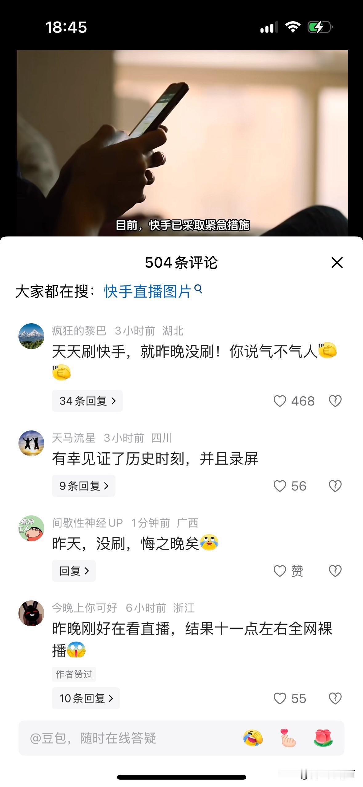 有听说吗? 昨晚十一点快手平台出现了大批小电影。 这么严谨的平台竟然会出这种事情! 有多少人听到这个消息是跟他一样的心情。 天天刷快手,就昨晚没刷,你说气人不气人! 遗憾,真的是遗憾。