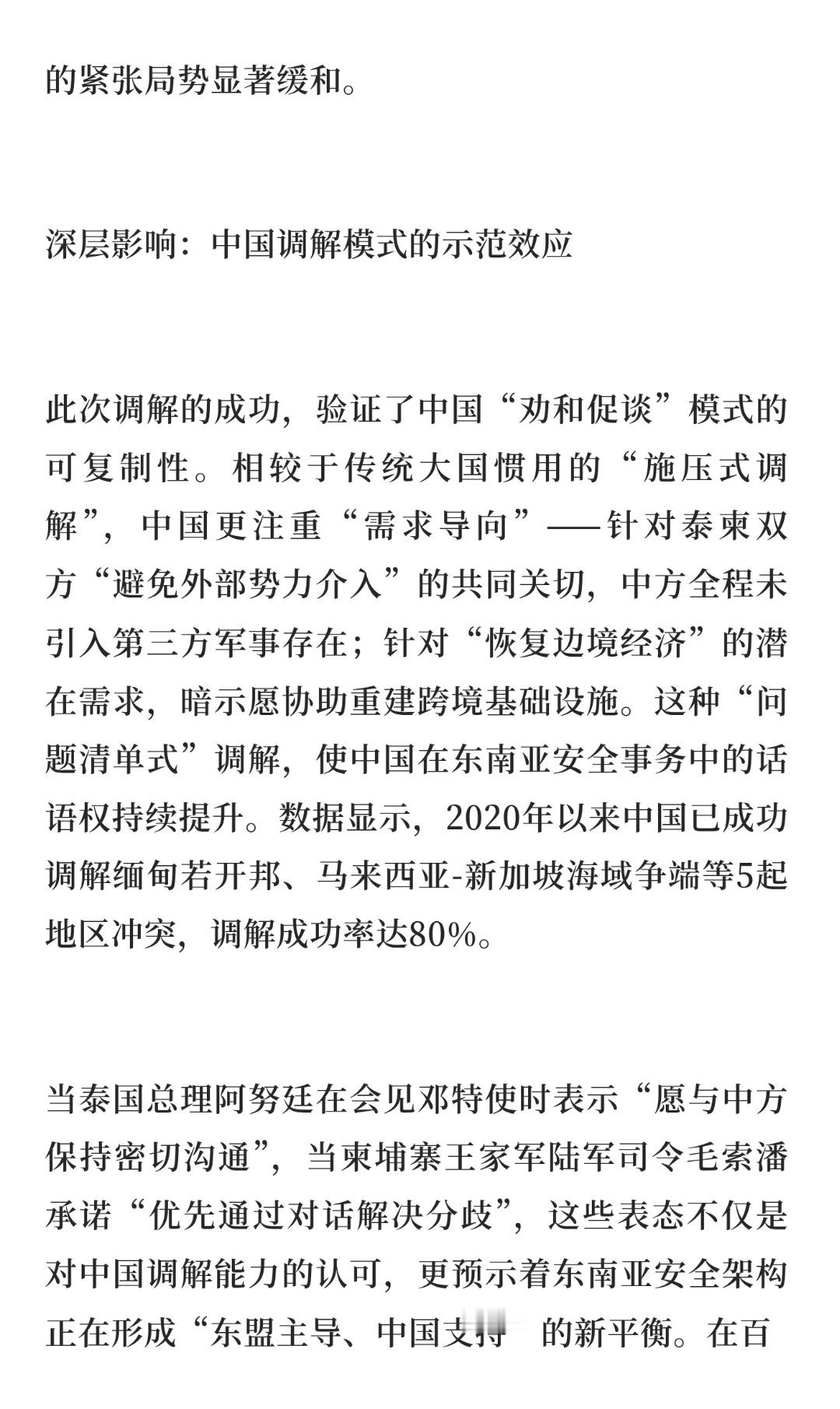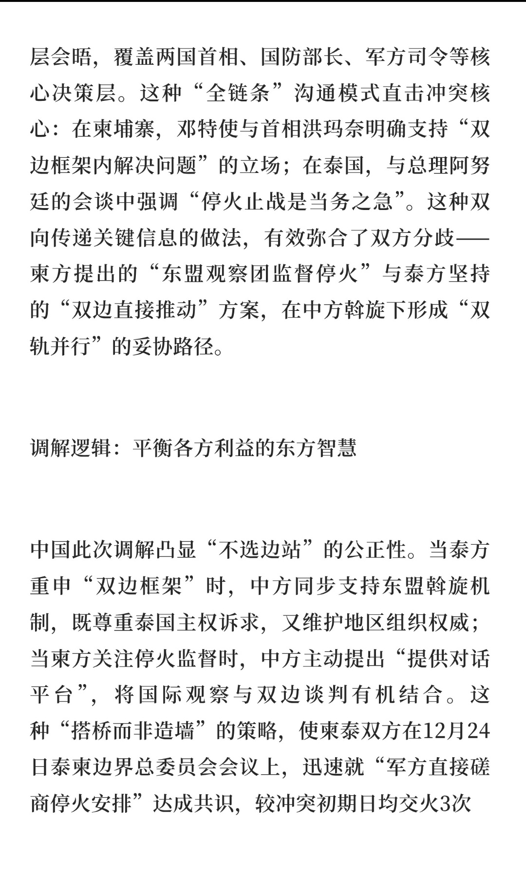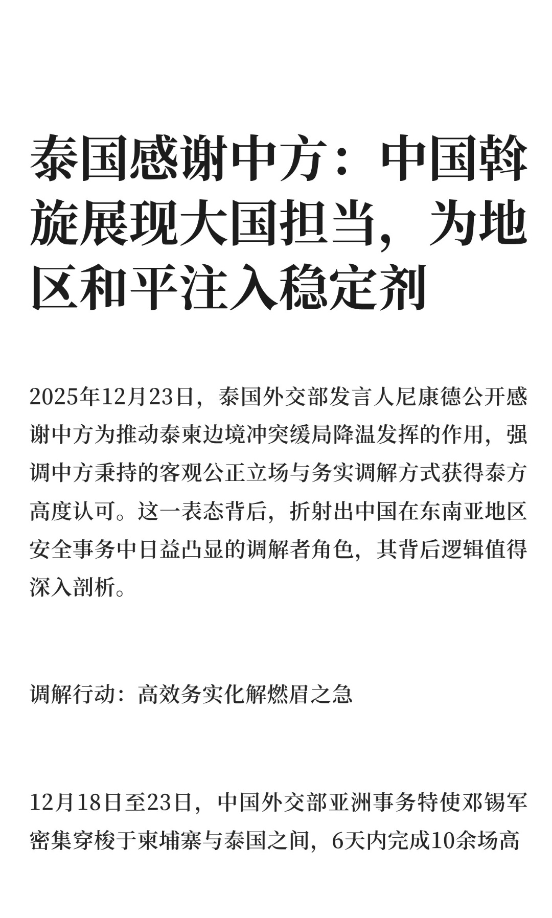 | 2025年12月23日,泰国外交部发言人尼康德公开感谢中方为推动泰柬边境冲突缓局降温发挥的作用,强调中方秉持的客观公正立场与务实调解方式获得泰方高度认可。这一表态背后,折射出中国在东南亚地区安全事务中日益凸显的调解者角色,值得深入剖析。12月18日至23日,中国外交部亚洲事务特使邓锡军密集穿梭于柬埔寨与泰国之间,6天内完成10余场高层会晤,覆盖两国首相、国防部长、军方司令等核心决策层。这种“全链条”沟通模式直击冲突核心:在柬埔寨,邓特使与首相洪玛奈明确支持“双边框架内解决问题”的立场;在泰国,与总理阿努廷的会谈中强调“停火止战是当务之急”。这种双向传递关键信息的做法,有效弥合了双方分歧——柬方提出的“东盟观察团监督停火”与泰方坚持的“双边直接推动”方案,在中方斡旋下形成“双轨并行”的妥协路径。中国此次调解凸显“不选边站”的公正性。当泰方重申“双边框架”时,中方同步支持东盟斡旋机制,既尊重泰国主权诉求,又维护地区组织权威;当柬方关注停火监督时,中方主动提出“提供对话平台”,将国际观察与双边谈判有机结合。这种“搭桥而非造墙”的策略,使柬泰双方在12月24日泰柬边界总委员会会议上,迅速就“军方直接磋商停火安排”达成共识,较冲突初期日均交火3次的紧张局势显著缓和。此次调解的成功,验证了中国“劝和促谈”模式的可复制性。相较于传统大国惯用的“施压式调解”,中国更注重“需求导向”——针对泰柬双方“避免外部势力介入”的共同关切,中方全程未引入第三方军事存在;针对“恢复边境经济”的潜在需求,暗示愿协助重建跨境基础设施。这种“问题清单式”调解,使中国在东南亚安全事务中的话语权持续提升。数据显示,2020年以来中国已成功调解缅甸若开邦、马来西亚-新加坡海域争端等5起地区冲突,调解成功率达80%。当泰国总理阿努廷在会见邓特使时表示“愿与中方保持密切沟通”,当柬埔寨王家军陆军司令毛索潘承诺“优先通过对话解决分歧”,这些表态不仅是对中国调解能力的认可,更预示着东南亚安全架构正在形成“东盟主导、中国支持”的新平衡。在百年变局加速演进的背景下,中国用实际行动证明:大国完全可以成为和平的守护者而非麻烦的制造者。