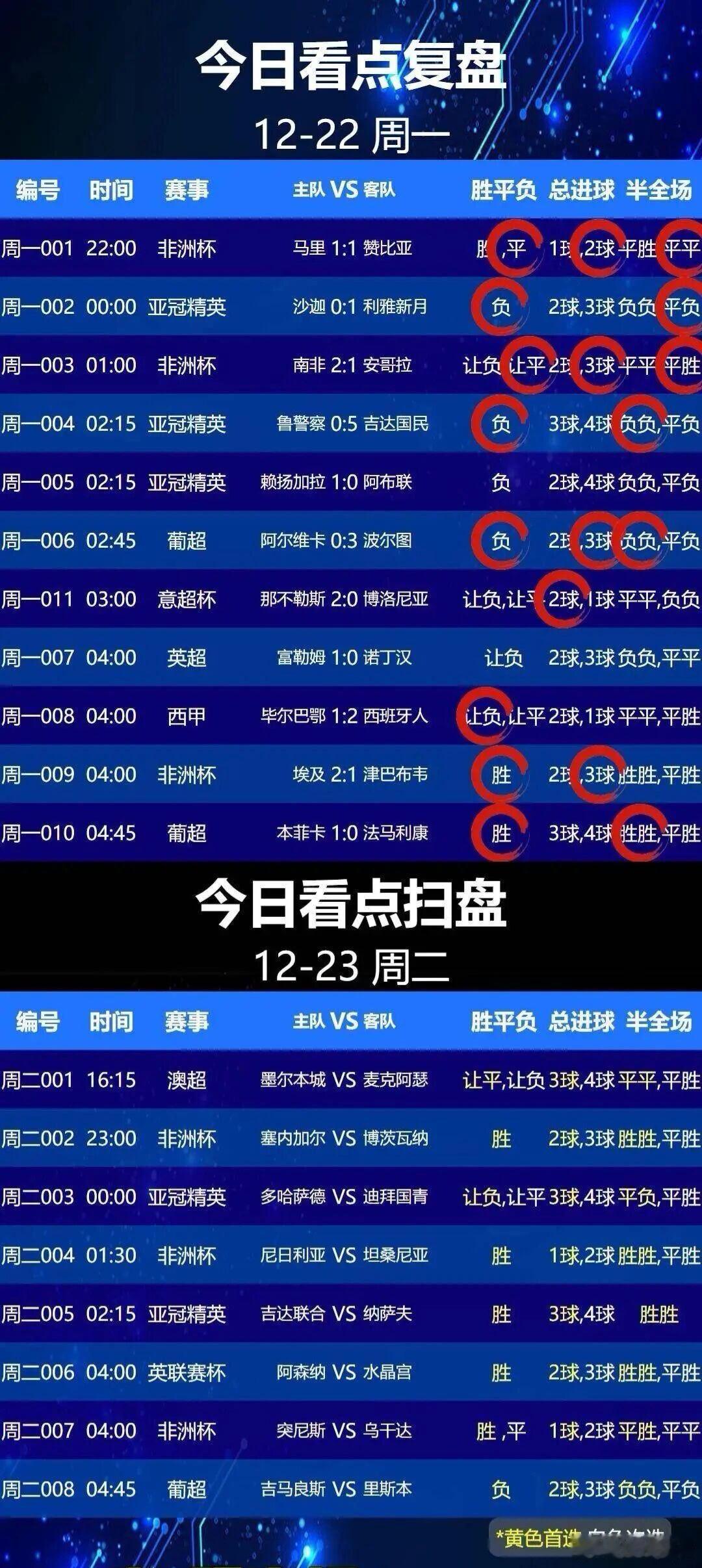 12月23日001 墨尔本城VS 麦克阿瑟002 塞内加尔 VS 博茨瓦纳 003 阿尔萨德 VS 迪拜国民004 尼日利亚 VS 坦桑尼亚
