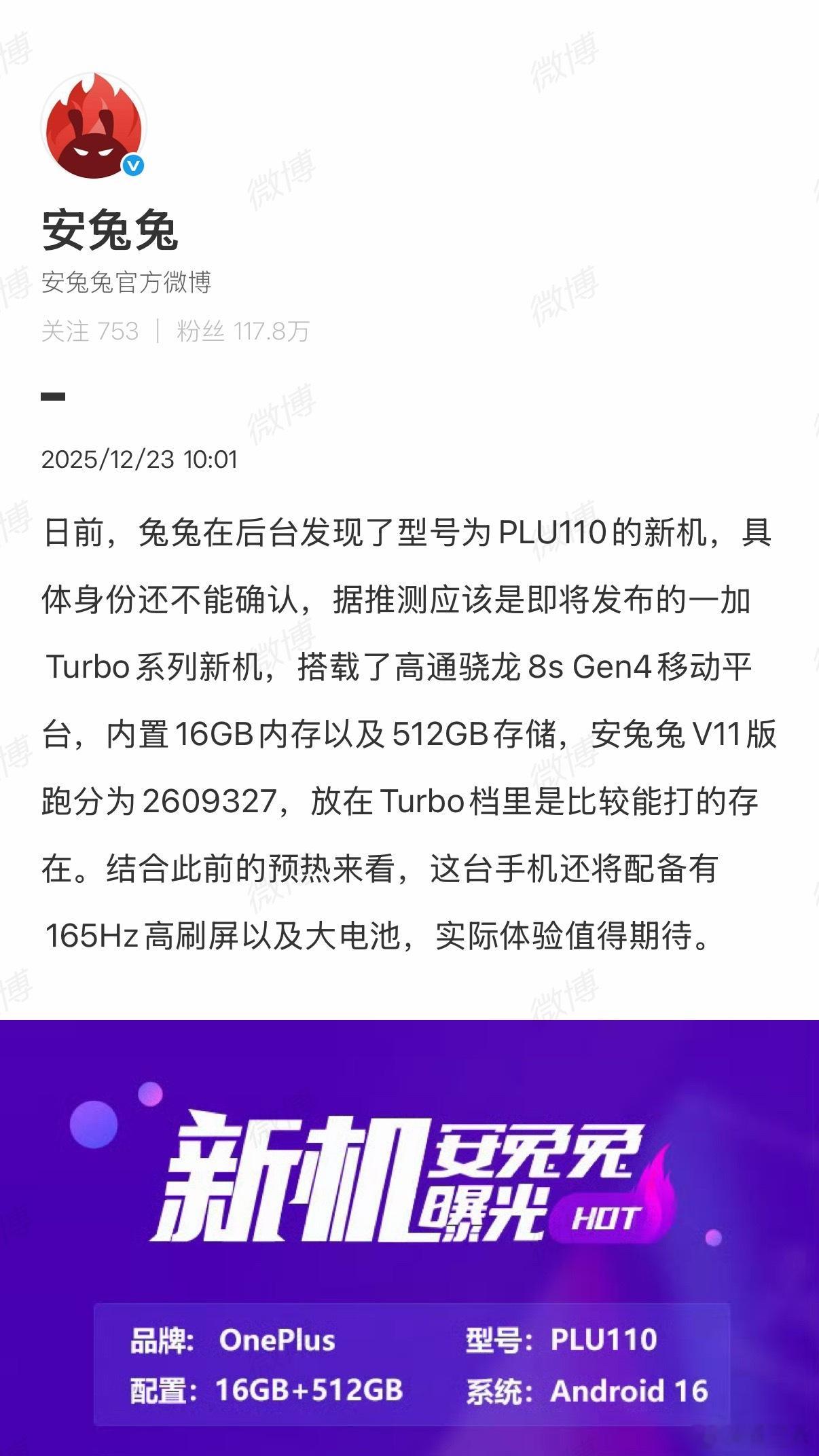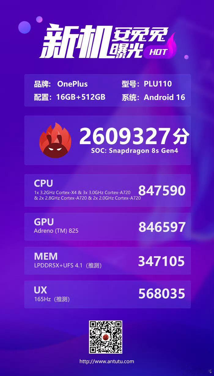 一加Turbo的跑分在260W左右,搭载的是骁龙8s Gen4,作为参考骁龙8至尊版的分数大概在320W左右,性能不错