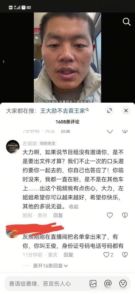 左姐怒指王大力:“你发这个视频,我很伤心!”原来,王大力在直播的时候解释自己没有去锦屏的原因,是节目组没有邀请自己! 其实就是王大力在直播间带节奏,暗示节目组不带他玩,结果左姐直接坐不住了,出来实名“反杀”。 最让人意外的是,左姐直接甩出了管理层名单,王大力(本名王俊)不仅在上面,还被排在了第四排,这重视程度可见一斑。 为了自证清白,连名单上的身份证号前缀都对上了,5134341开头的四川越西县,确实就是王大力的老家,这下真是想赖都赖不掉。 我挺纳闷的,左姐说临出发前还专门确认过好几次,他也口头答应了,结果大部队走的时候他玩起了“失踪”,当时大家还以为他在别的车上呢。 说实话,连已经退赛的背包客名字都还在单子上,节目组真没理由唯独把他给漏了,这逻辑上明显说不通。 不过也有个小细节挺微妙,有网友提到退赛选手里好像也有个倒霉蛋叫“王俊”,不知道这是不是王大力拿来打掩护的借口,或者是真的闹了乌龙。 但说到底,既然名单上白纸黑字写着名字,再在直播里卖惨博同情,这波操作确实让共事的人挺寒心的。 我觉得成年人之间有什么误会私下说清楚就好,非要在镜头前演这出,被证据甩在脸上的时候是真的很难看。