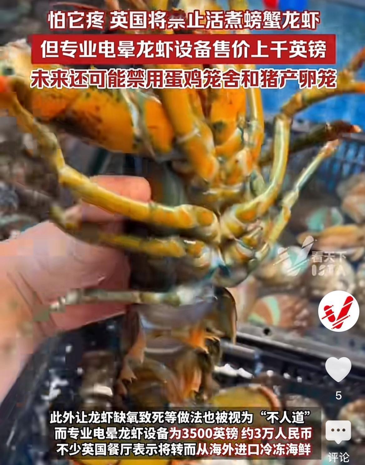 假新闻? 近日,英国拟立法:禁止将活龙虾直接下锅烹煮,需先将其冷冻或电击至昏迷!原因是活煮或使其缺氧的做法,被指“不人道”? 有商家抱怨专业电龙虾设备价格太贵,这项规定会迫使商家转而从海外进口冷冻海鲜。