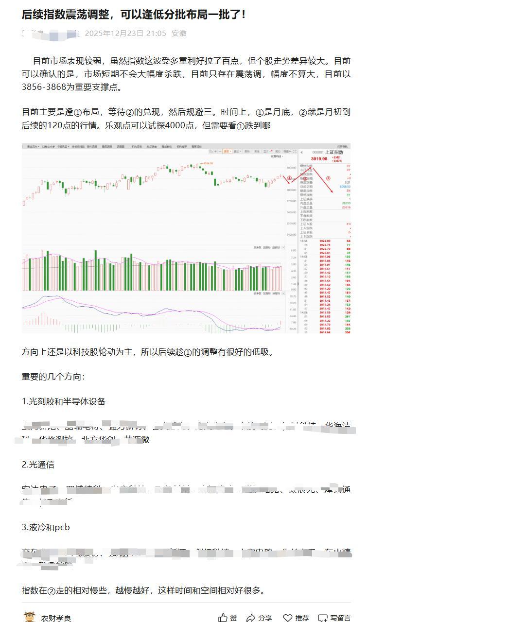 元旦之前基本以震荡调整为主,但是较好的逢低布局点 时间上月底,支撑看3856-3868 目前指数调整不是很大的风险,主要是给到选行业的机会。 光刻胶、半导体设备、液冷、PCB、还有锂电池材料 后面行情主要是科技股的轮动性质的,那些下跌趋势的没有明显利好将很难有机会。 可以认为是上面的维稳行情 由于3815到现在的行情乱,成色较差,所以需要后续几天的震荡调整用来分化,暂时不看新低,新低在拉升一波之后。 可以趁①的调整分批布局一些,等待②的兑现,然后防③的风险。 我更倾心于等1-2次普跌,情绪低落的冰点,那就逢低布局即可。 暂且流动性问题短时间解决,后续震荡调整也会缩量,基本不会放量下杀,缩到接近上一轮地量或1.7万亿左右都可以。 那就耐心选股,等待跨年的丰收。 人形机器人昨日表现了,后续也可关注 股市有风险,入市需谨慎,个人观点不代表任何投资建议,大家要独立思考,明辨是非。