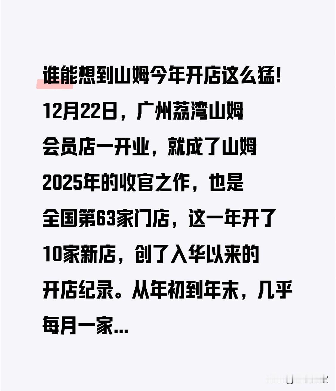 谁能想到山姆今年开店这么猛!12月22日,广州荔湾山姆会员店一开业,就成了山姆2025年的收官之作,也是全国第63家门店,这一年开了10家新店,创了入华以来的开店纪录。从年初到年末,几乎每月一家新店,从嘉兴、合肥,一路开到广州,扩张版图不断扩大。 这家荔湾店占地近2万平,还有超1000个停车位,挨着地铁站和高速口,甚至能辐射广佛两地。开业时,有顾客直接抢下了最后一件网红瑞士卷,火爆程度可见一斑。 山姆这疯狂的开店节奏,让人不禁想问:未来它还会在哪些城市继续布局?会不会带来更多新奇的商品?在激烈的零售市场中,它又能否持续保持这样的扩张势头呢? 山姆专卖店 山姆选购攻略 山姆超省攻略 山姆闭店 山姆专卖店 山姆选购攻略 山姆超省攻略 山姆闭店 山姆亦庄店 东莞山姆 东莞山姆店
