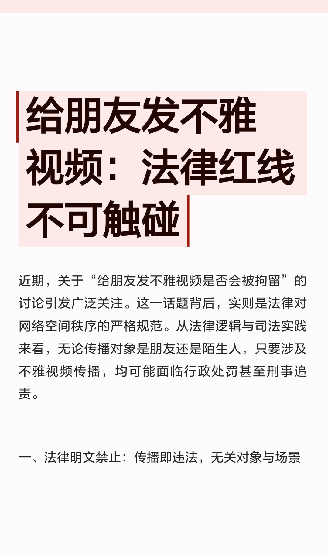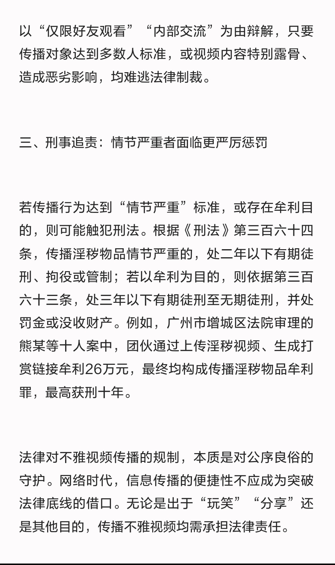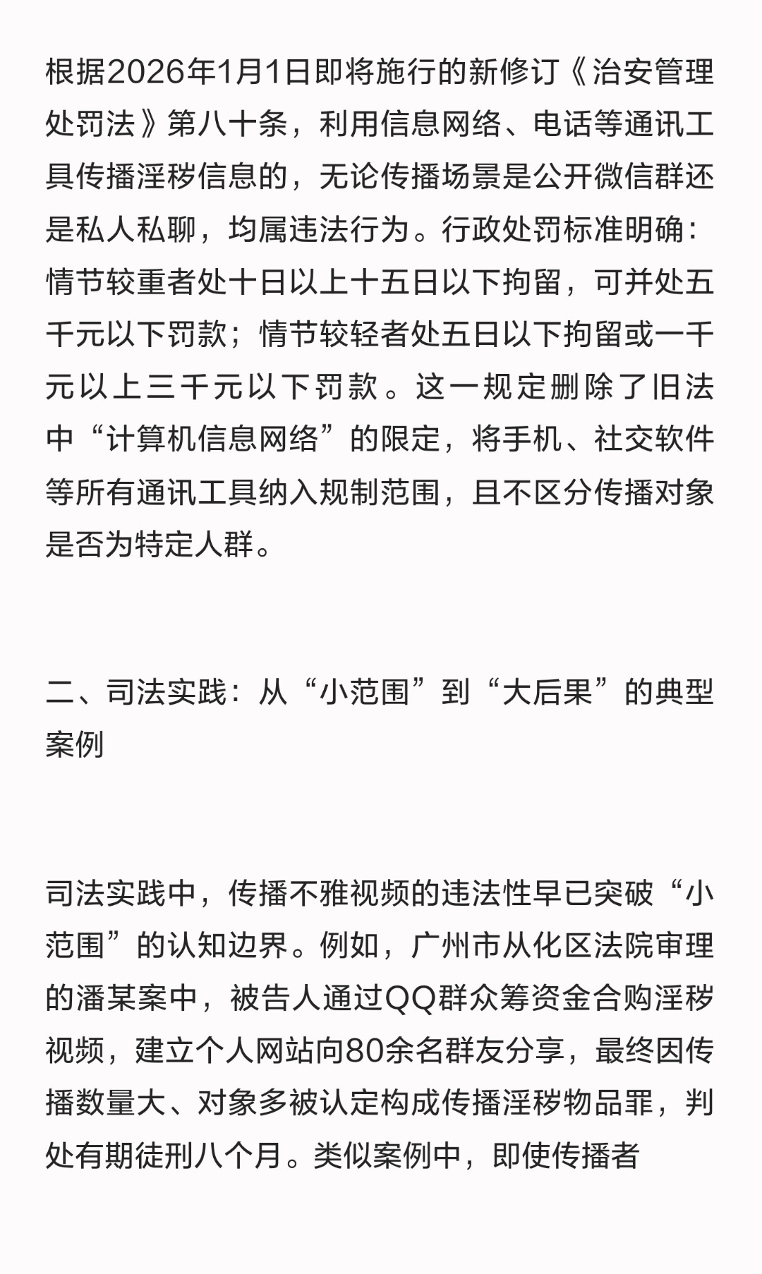 | 近期,关于“给朋友发不雅视频是否会被拘留”的讨论引发广泛关注。这一话题背后,实则是法律对网络空间秩序的严格规范。从法律与司法实践来看,无论传播对象是朋友还是陌生人,只要涉及不雅视频传播,均可能面临行政处罚甚至刑事追责。根据2026年1月1日即将施行的新修订《治安管理处罚法》第八十条,利用信息网络、电话等通讯工具传播淫秽信息的,无论传播场景是公开微信群还是私人私聊,均属违法行为。行政处罚标准明确:情节较重者处十日以上十五日以下拘留,可并处五千元以下罚款;情节较轻者处五日以下拘留或一千元以上三千元以下罚款。这一规定删除了旧法中“计算机信息网络”的限定,将手机、社交软件等所有通讯工具纳入规制范围,且不区分传播对象是否为特定人群。司法实践中,传播不雅视频的违法性早已突破“小范围”的认知边界。例如,广州市从化区法院审理的潘某案中,被告人通过QQ群众筹资金合购淫秽视频,建立个人网站向80余名群友分享,最终因传播数量大、对象多被认定构成传播淫秽物品罪,判处有期徒刑八个月。类似案例中,即使传播者以“仅限好友观看”“内部交流”为由辩解,只要传播对象达到多数人标准,或视频内容特别露骨、造成恶劣影响,均难逃法律制裁。若传播行为达到“情节严重”标准,或存在牟利目的,则可能触犯刑法。根据《刑法》第三百六十四条,传播淫秽物品情节严重的,处二年以下有期徒刑、拘役或管制;若以牟利为目的,则依据第三百六十三条,处三年以下有期徒刑至无期徒刑,并处罚金或没收财产。例如,广州市增城区法院审理的熊某等十人案中,团伙通过上传淫秽视频、生成打赏链接牟利26万元,最终均构成传播淫秽物品牟利罪,最高获刑十年。法律对不雅视频传播的规制,本质是对公序良俗的守护。网络时代,信息传播的便捷性不应成为突破法律底线的借口。无论是出于“玩笑”“分享”还是其他目的,传播不雅视频均需承担法律责任。