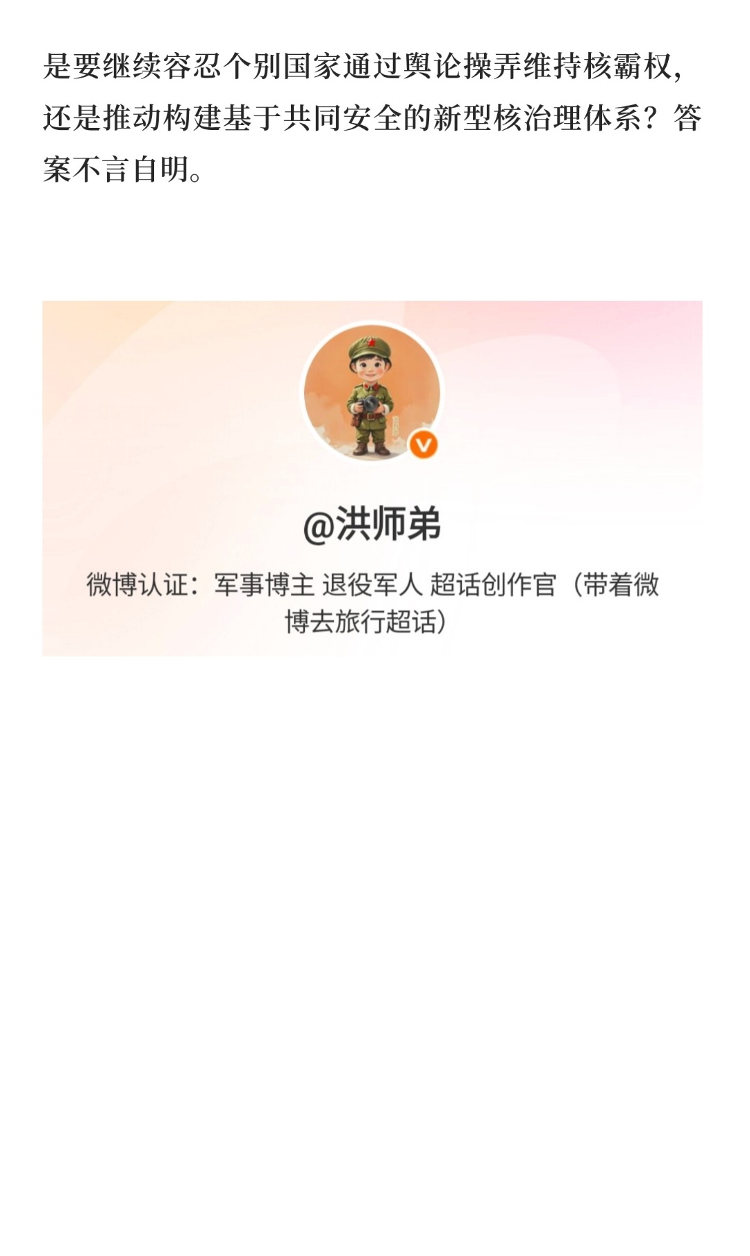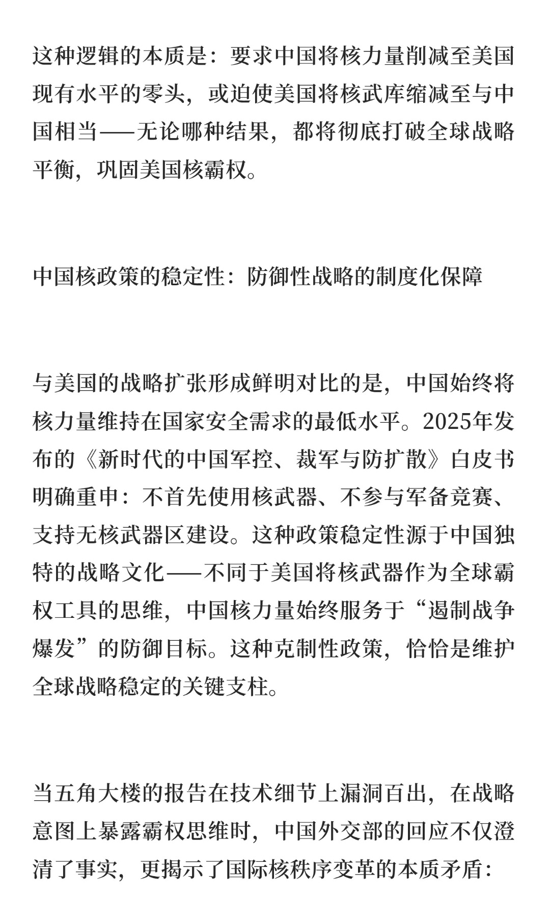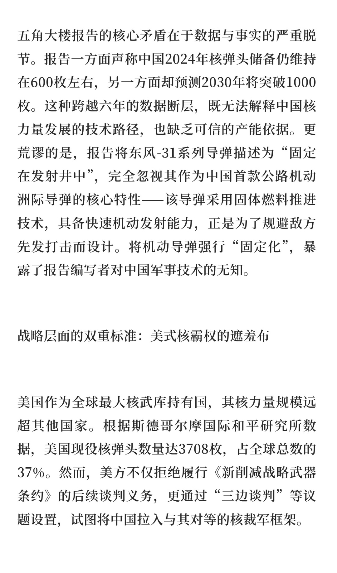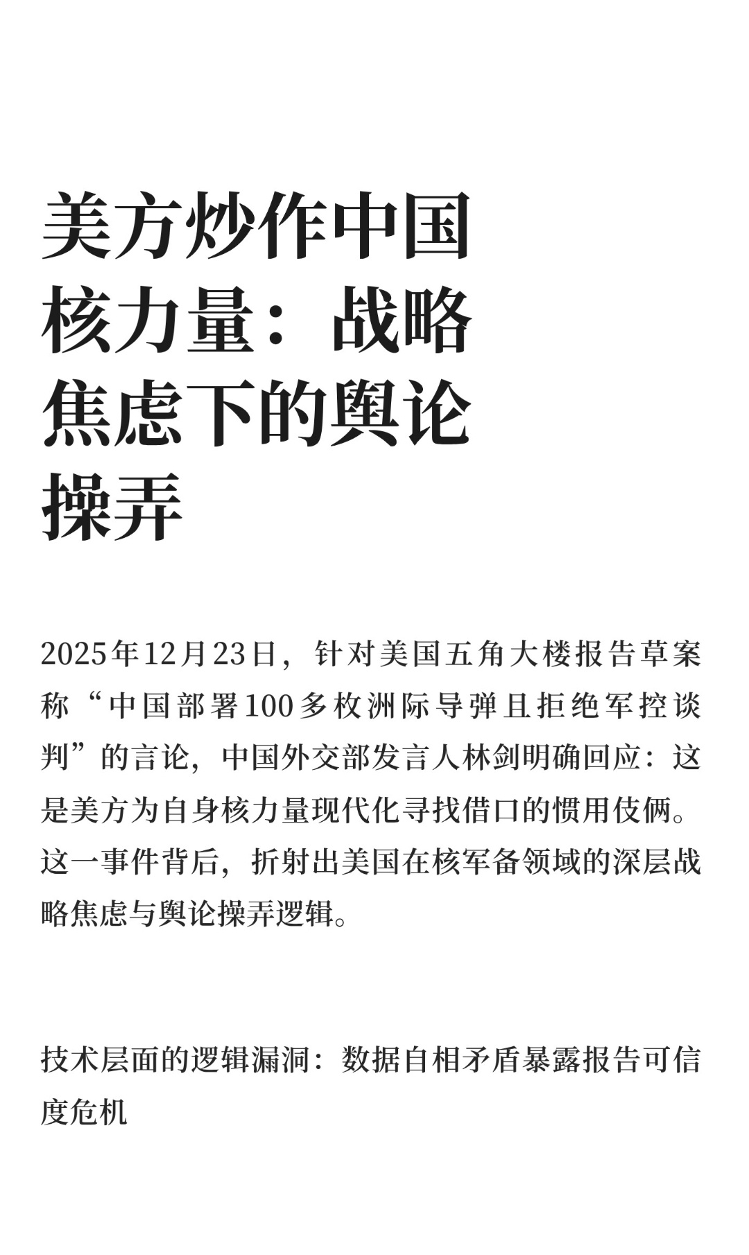 | 2025年12月23日,针对美国五角大楼报告草案称“中国部署100多枚洲际导弹且拒绝军控谈判”的言论,中国外交部发言人林剑明确回应:这是美方为自身核力量现代化寻找借口的惯用伎俩。五角大楼报告的核心矛盾在于数据与事实的严重脱节。报告一方面声称中国2024年核弹头储备仍维持在600枚左右,另一方面却预测2030年将突破1000枚。这种跨越六年的数据断层,既无法解释中国核力量发展的技术路径,也缺乏可信的产能依据。更荒谬的是,报告将东风-31系列导弹描述为“固定在发射井中”,完全忽视其作为中国首款公路机动洲际导弹的核心特性——该导弹采用固体燃料推进技术,具备快速机动发射能力,正是为了规避敌方先发打击而设计。将机动导弹强行“固定化”,暴露了报告编写者对中国军事技术的无知。美国作为全球最大核武库持有国,其核力量规模远超其他国家。根据斯德哥尔摩国际和平研究所数据,美国现役核弹头数量达3708枚,占全球总数的37%。然而,美方不仅拒绝履行《新削减战略武器条约》的后续谈判义务,更通过“三边谈判”等议题设置,试图将中国拉入与其对等的核裁军框架。这种逻辑的本质是:要求中国将核力量削减至美国现有水平的零头,或迫使美国将核武库缩减至与中国相当——无论哪种结果,都将彻底打破全球战略平衡,巩固美国核霸权。与美国的战略扩张形成鲜明对比的是,中国始终将核力量维持在国家安全需求的最低水平。2025年发布的《新时代的中国军控、裁军与防扩散》白皮书明确重申:不首先使用核武器、不参与军备竞赛、支持无核武器区建设。这种政策稳定性源于中国独特的战略文化——不同于美国将核武器作为全球霸权工具的思维,中国核力量始终服务于“遏制战争爆发”的防御目标。这种克制性政策,恰恰是维护全球战略稳定的关键支柱。当五角大楼的报告在技术细节上漏洞百出,在战略意图上暴露霸权思维时,中国外交部的回应不仅澄清了事实,更揭示了国际核秩序变革的本质矛盾:是要继续容忍个别国家通过舆论操弄维持核霸权,还是推动构建基于共同安全的新型核治理体系?答案不言自明。