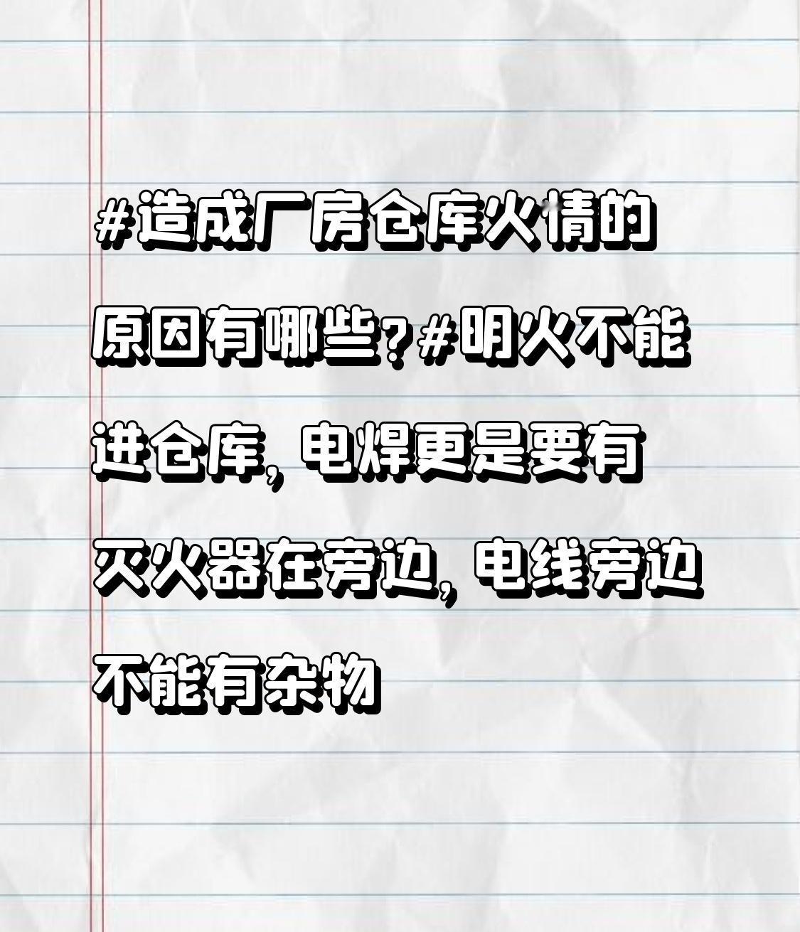 造成厂房仓库火情的原因有哪些? 厂房仓库火情原因可不少。像违规电焊,作业时熔融金属火花飞溅,无证焊接、未清周围可燃物等违规操作,极易引发火灾。电气线路故障也是常见原因,2025年10月8日,闽侯某家居制造公司就因电气线路故障起火。 可燃物质堆放不规范、违规使用易燃材料也很危险。比如该家居公司随意堆放易燃杂物。还有“厂中厂”模式下,安全管理责任不清、监管缺位,像闽侯某洗涤公司切割烟囱引燃木屑粉尘,就是现场违规电焊且无防火隔离措施导致。另外,消防设施不完善、火灾发现晚等也会造成严重后果。所以厂房仓库防火,每一个细节都不能忽视。 安全第一!这场大火死了五十几个人