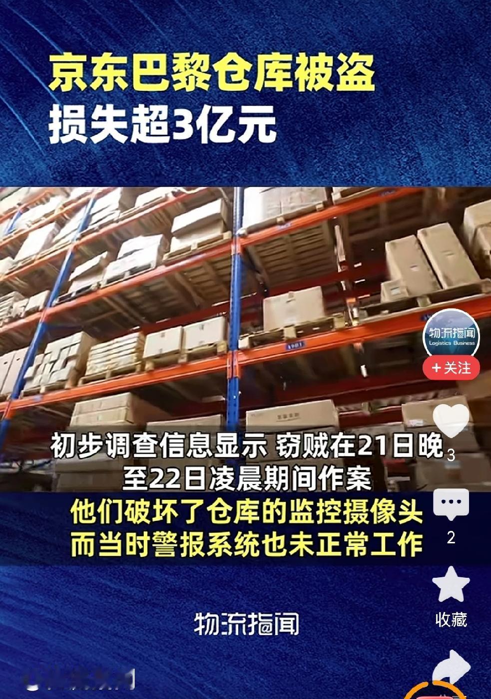 很蹊跷,摄像头被损坏,报警系统未正常,5万多件手机和电脑一夜之间全没了。 这盗贼仿佛开了天眼,如入无人之境,知道去哪里破坏摄像头,在哪里关闭报警系统,还知道仓库里有啥,5万多件货,靠人搬出去吗? 如果卢浮宫被盗是因为稀缺导致价值连城的珠宝,那现在的手机和电脑普及到遍地都是的程度,发达国家的欧洲人,缺这玩意儿吗? 合理怀疑作案动机。 合理怀疑内部有鬼。 京东巴黎危,是想给中国的京东下马威,还是为法国的营商环境贴告示?法国能不能安然无恙?马克龙政府如何应对?