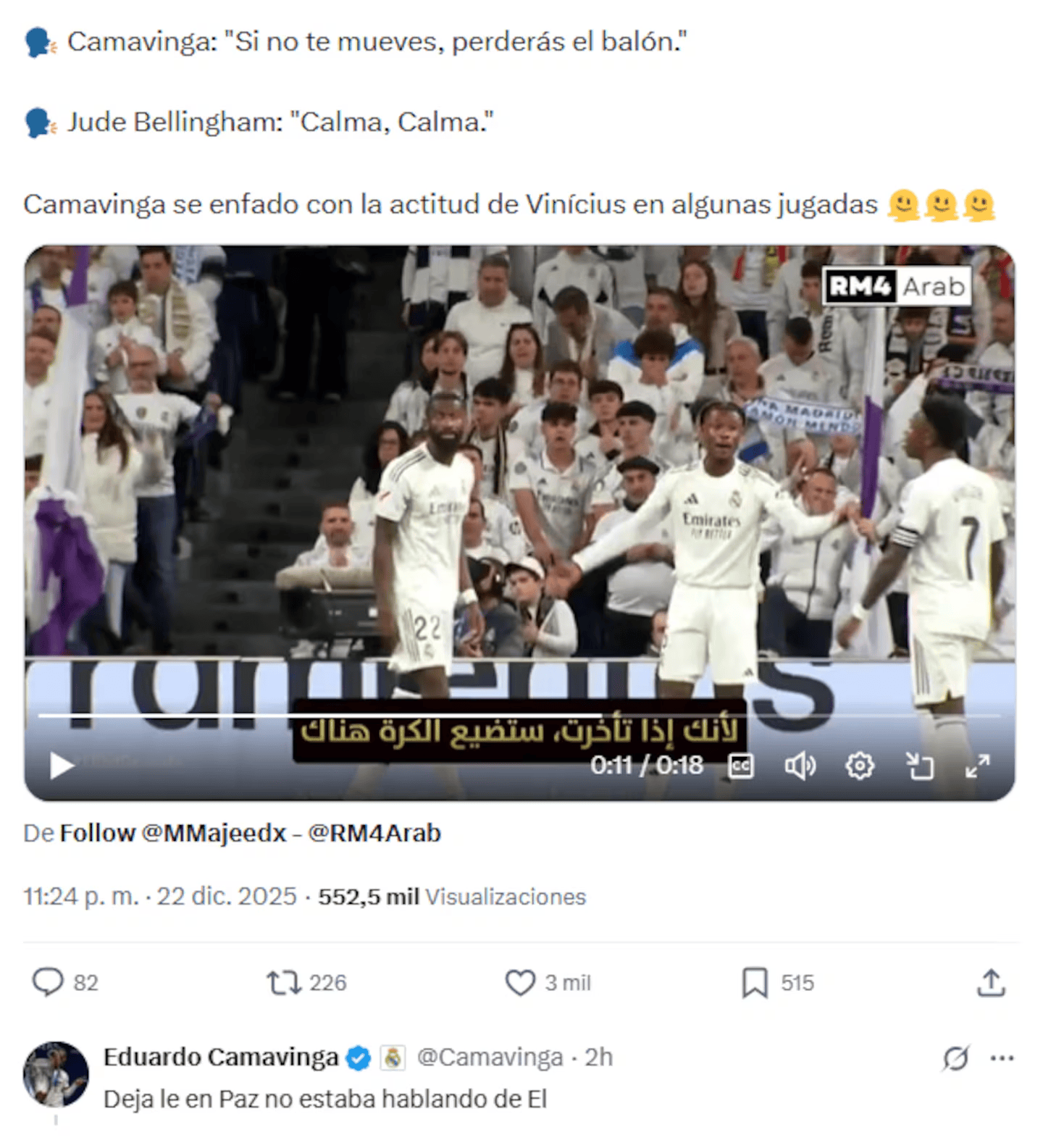 虎扑12月23日讯近日,围绕皇马中场卡马文加与队友维尼修斯之间关系的讨论在社交媒体上发酵。对此,卡马文加本人已在社交平台X上作出回应,否认自己在比赛中对维尼修斯不满或进行指责。