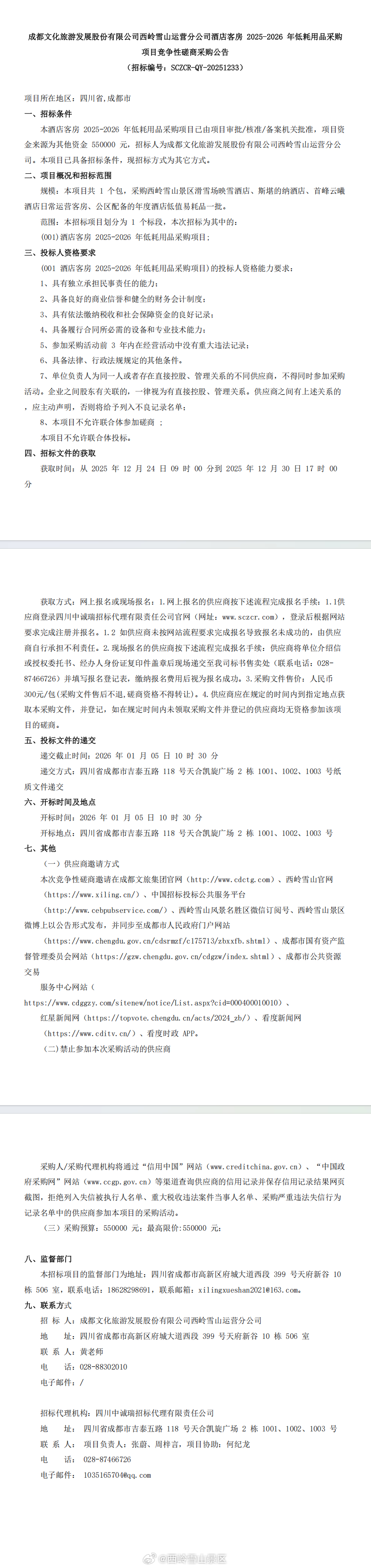 成都文化旅游发展股份有限公司西岭雪山运营分公司酒店客房2025-2026年低耗用品采购项目竞争性磋商采购公告