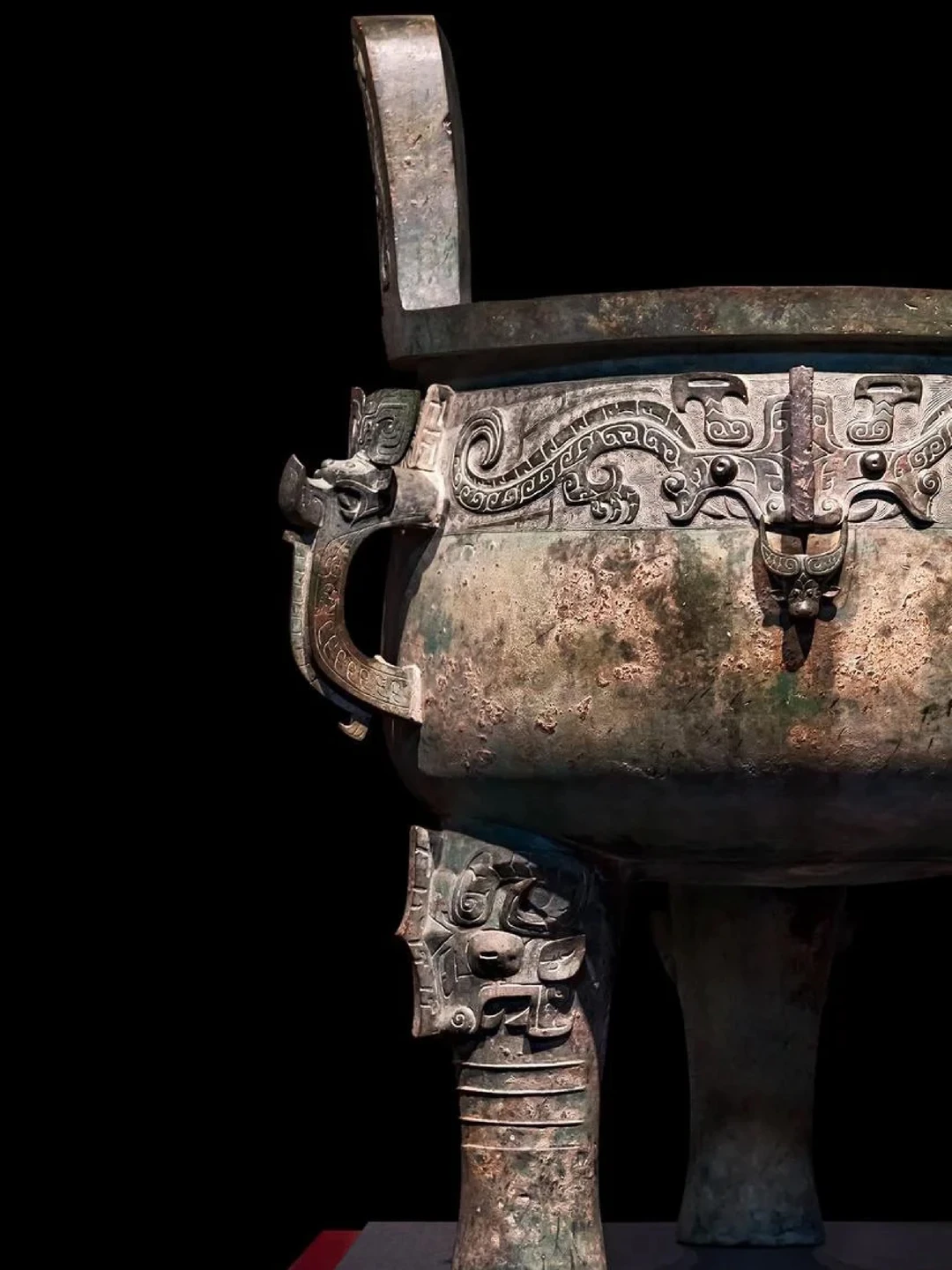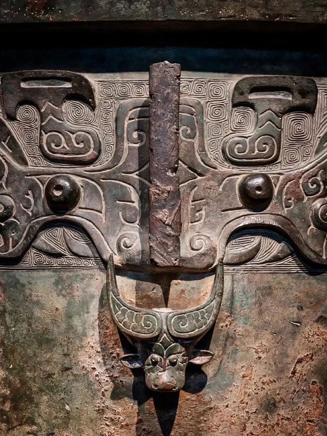 每对夔龙中央伸出一只立体牛头,牛角高翘,象征祭祀最高规格“太牢之礼”;