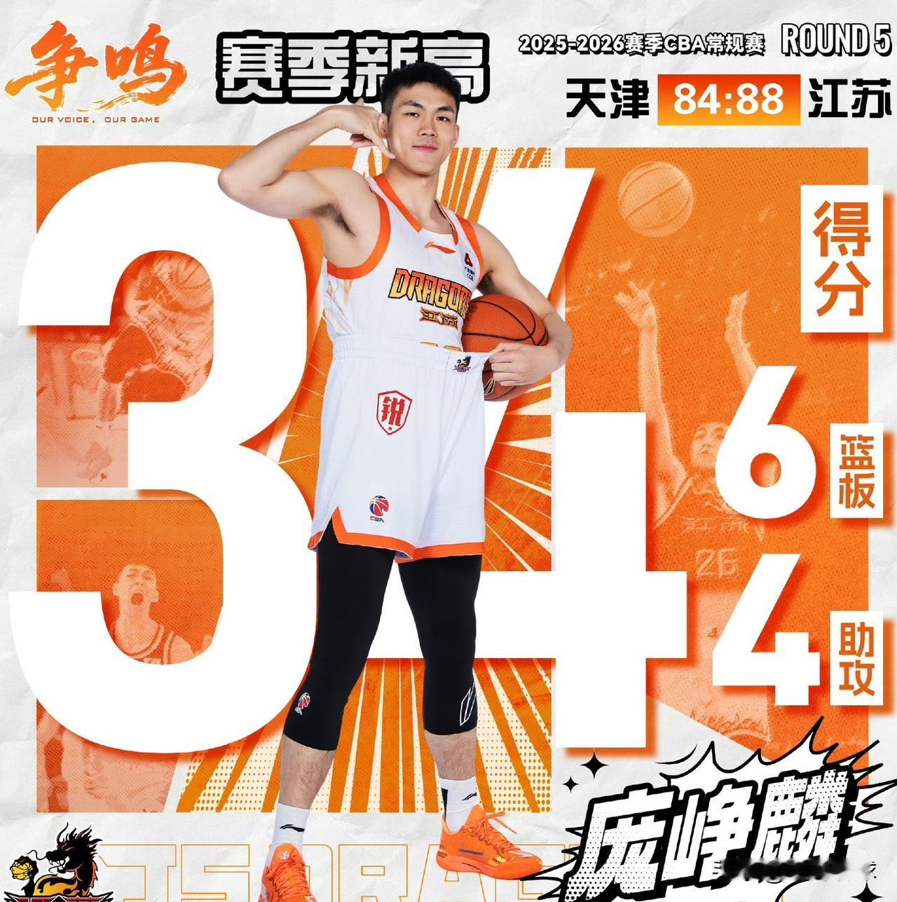 最强新秀庞峥麟来了! 天津先行者84-88不敌江苏肯帝亚, 本场江苏肯帝亚的新秀庞峥麟砍下生涯新高34分6篮板4助攻,目前与南京郭昊文并列成为CBA的国内球员得分王,外援贾尔斯25分13篮板,亨特16分4助攻!