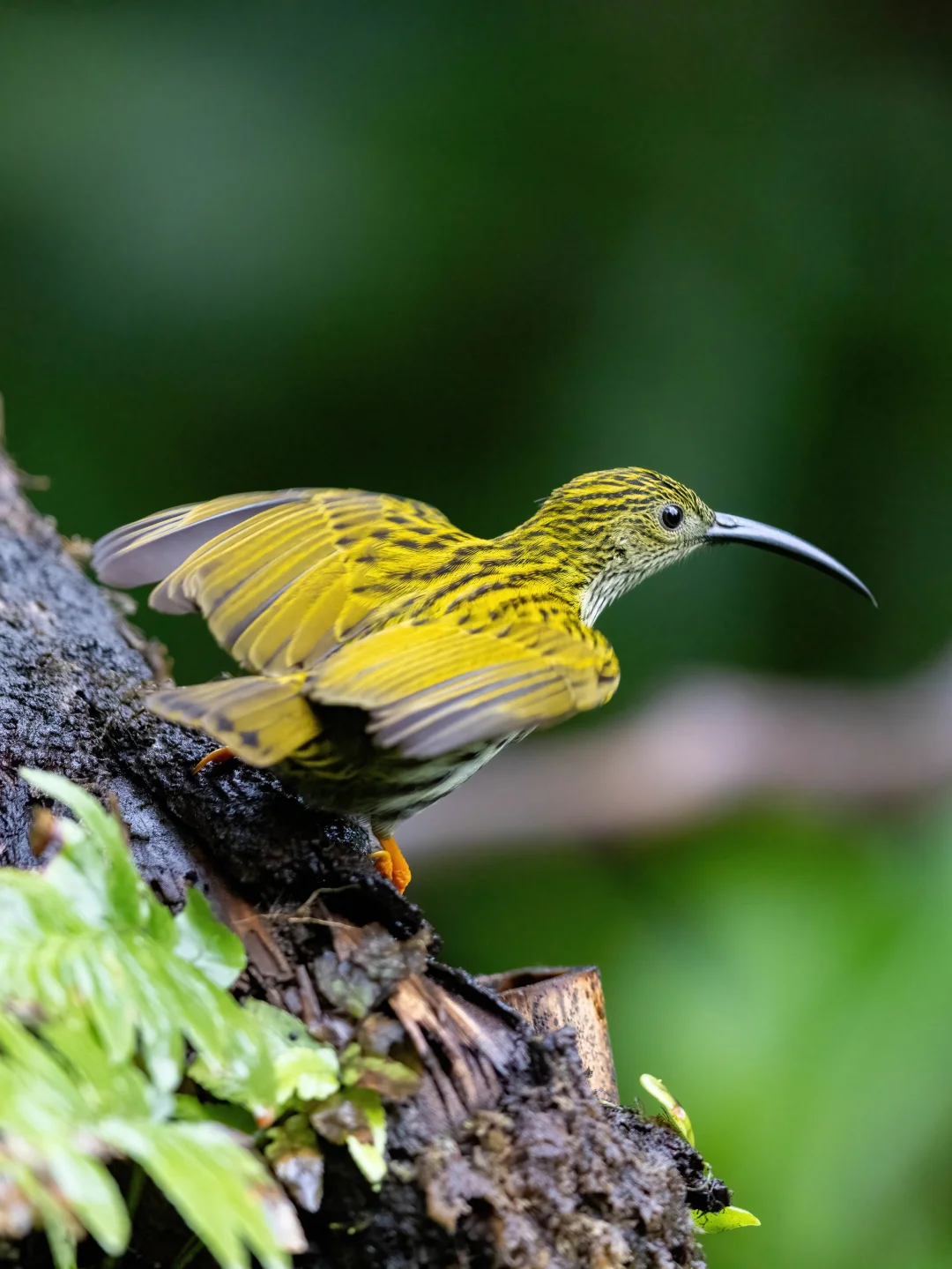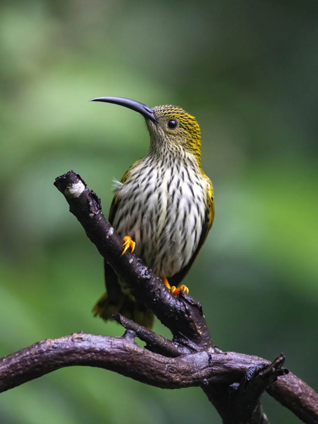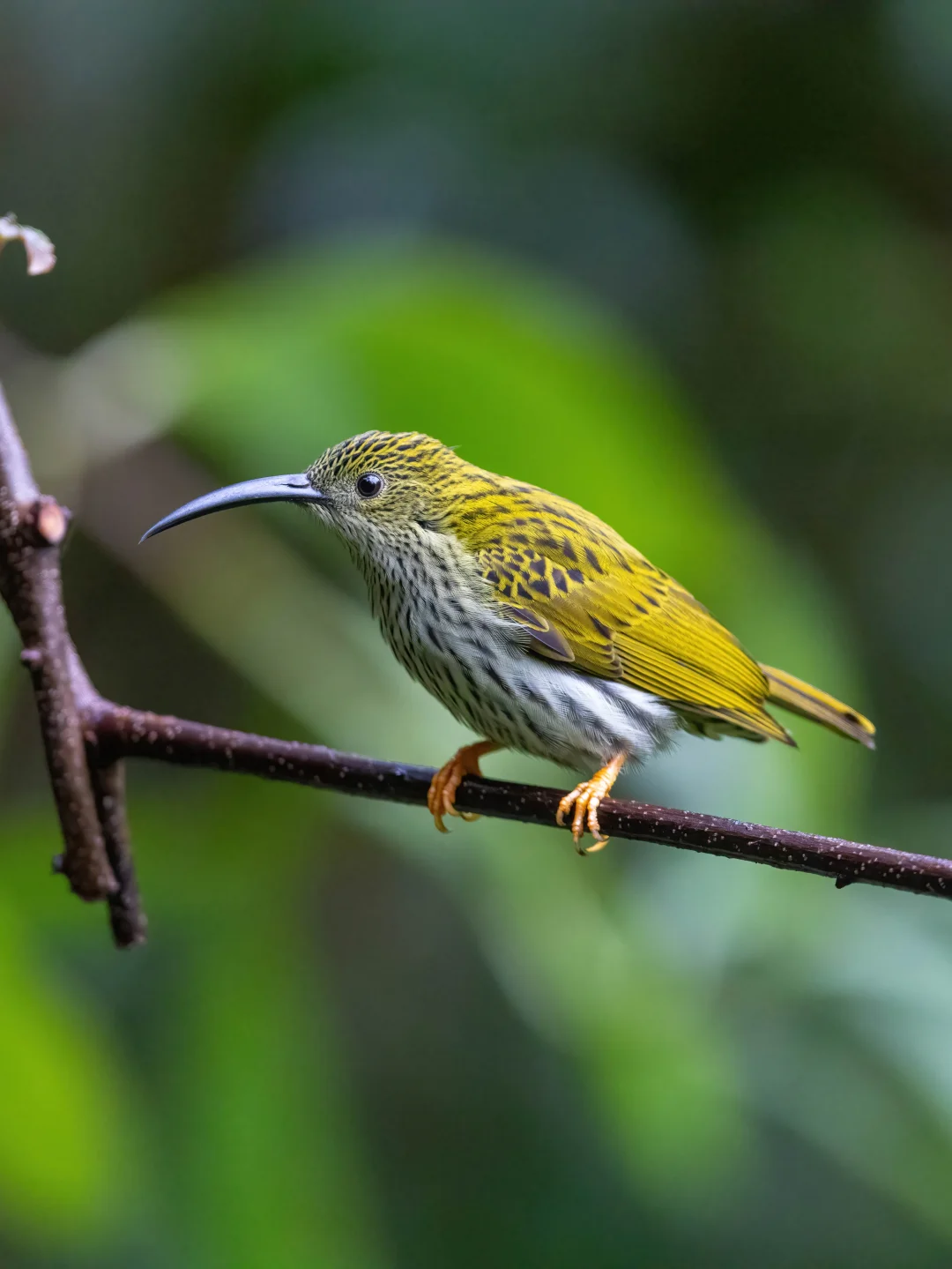 原创拍摄于2024.12 纹背捕蛛鸟,雀形目太阳鸟科捕蛛鸟属。 在太阳鸟科里面纹背捕蛛鸟算是大型鸟,但是放眼鸟界,它绝对是小巧的鸟,身体拉长全长大约20厘米,嘴大概就占了1/4。它们的特征也非常明显,头背金色黄绿橄榄色,腹部非常浅的黄白色,全身布满黑色斑纹。长长的嘴便于吸蜜,也便于捕捉蜘蛛。 值得一提的是,它们的巢常常被各种杜鹃巢寄生[笑哭R]