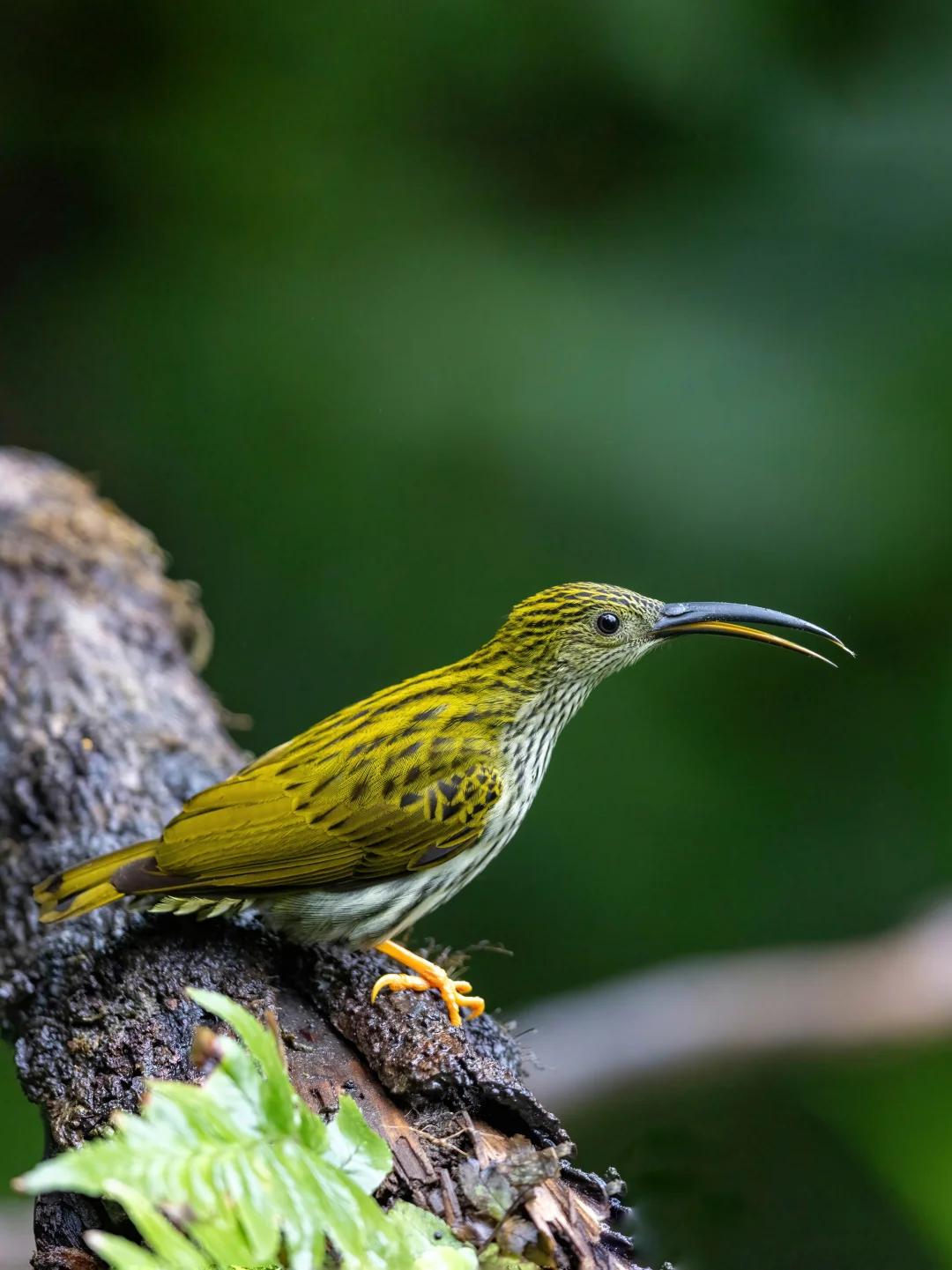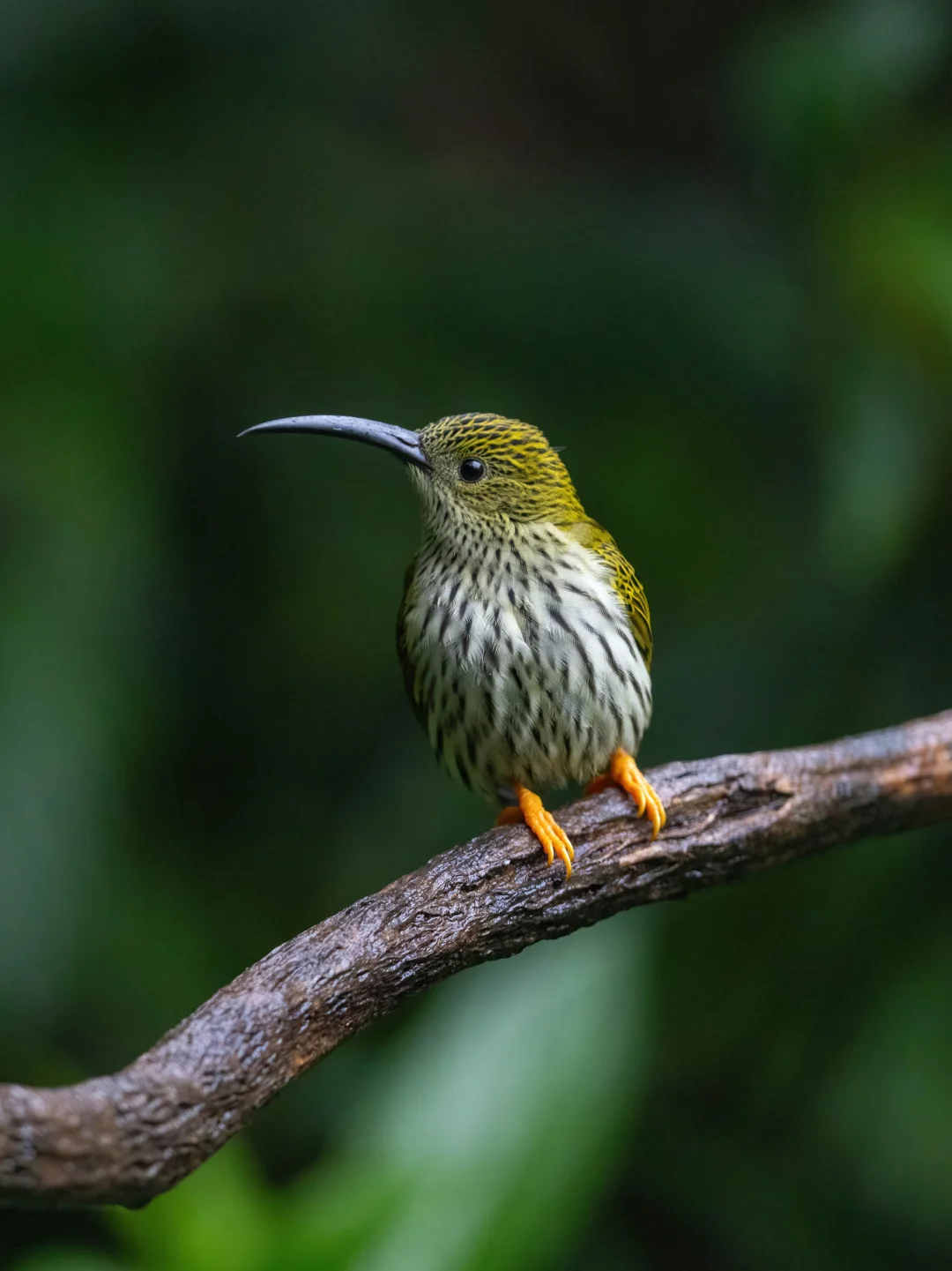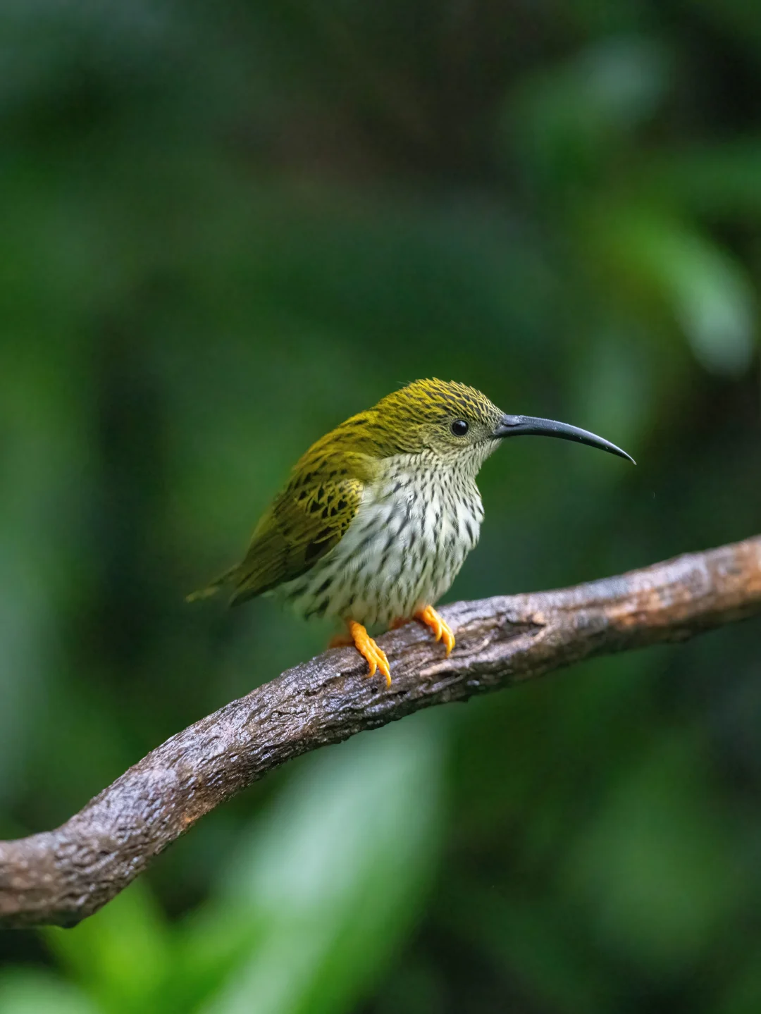 原创拍摄于2024.12 纹背捕蛛鸟,雀形目太阳鸟科捕蛛鸟属。 在太阳鸟科里面纹背捕蛛鸟算是大型鸟,但是放眼鸟界,它绝对是小巧的鸟,身体拉长全长大约20厘米,嘴大概就占了1/4。它们的特征也非常明显,头背金色黄绿橄榄色,腹部非常浅的黄白色,全身布满黑色斑纹。长长的嘴便于吸蜜,也便于捕捉蜘蛛。 值得一提的是,它们的巢常常被各种杜鹃巢寄生[笑哭R]
